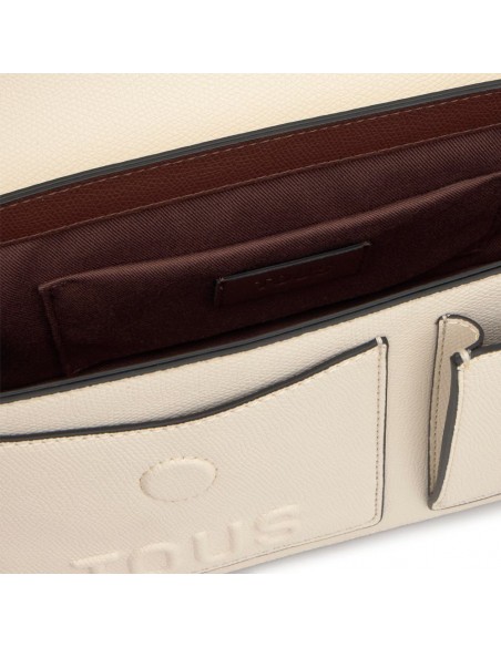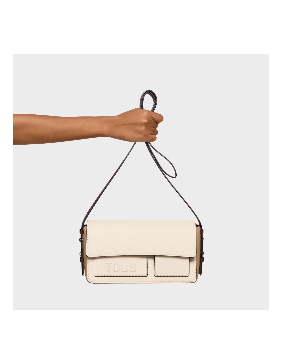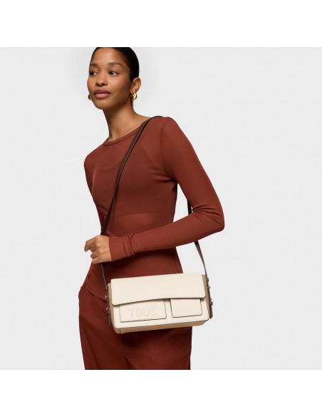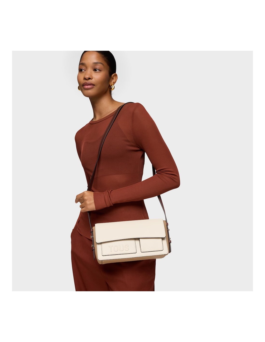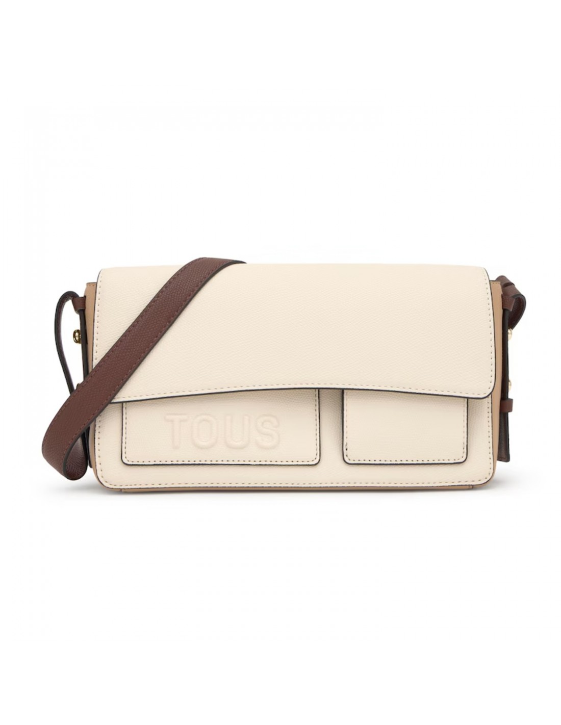 El bolso bandolera mediano TOUS Back to Basics está fabricado en poliuretano y destaca por su elegante combinación de colores beige y marrón.