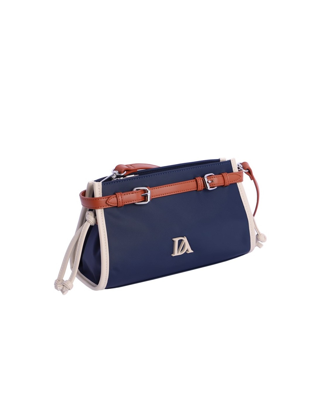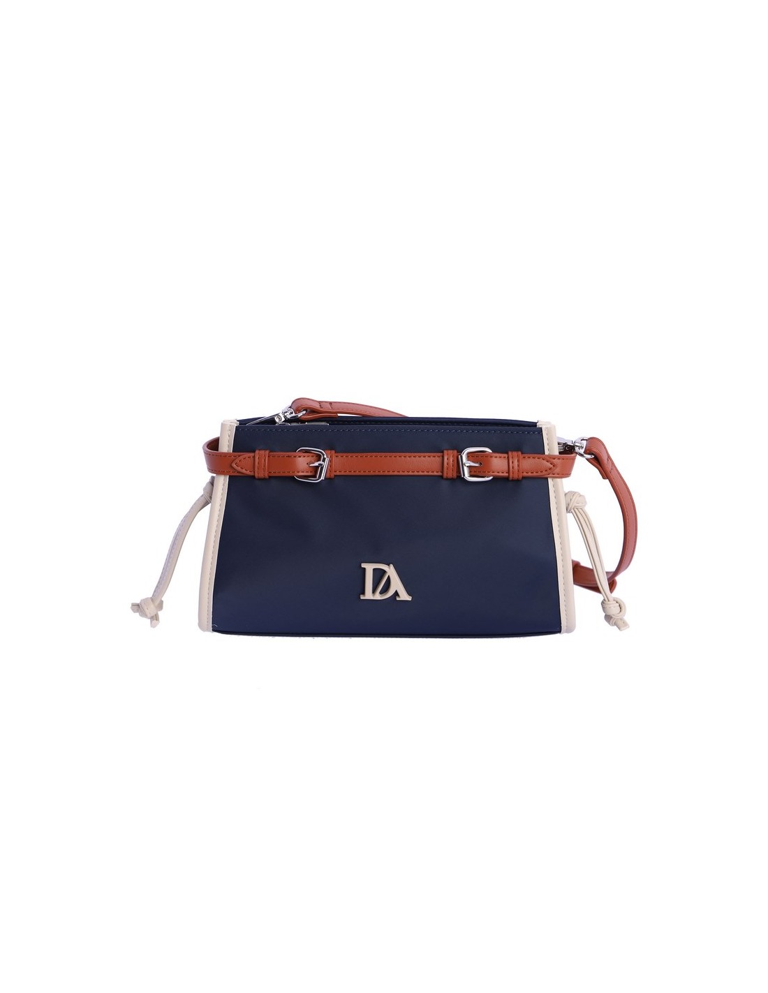 Bolso bandolera Alborán de Don Algodón de nailon con el logo en la parte frontal. Tiene cierre de cremallera. Destaca por su correa decorativa tipo cinturón y unos cordones colgantes en los laterales de piel sintética.