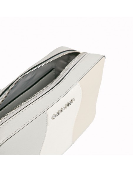Bandolera Calvin Klein de mujer confeccionada en material poliuretano con forro de tejido de poliéster 100% reciclado. Presenta una atractiva combinación en tonos beig.