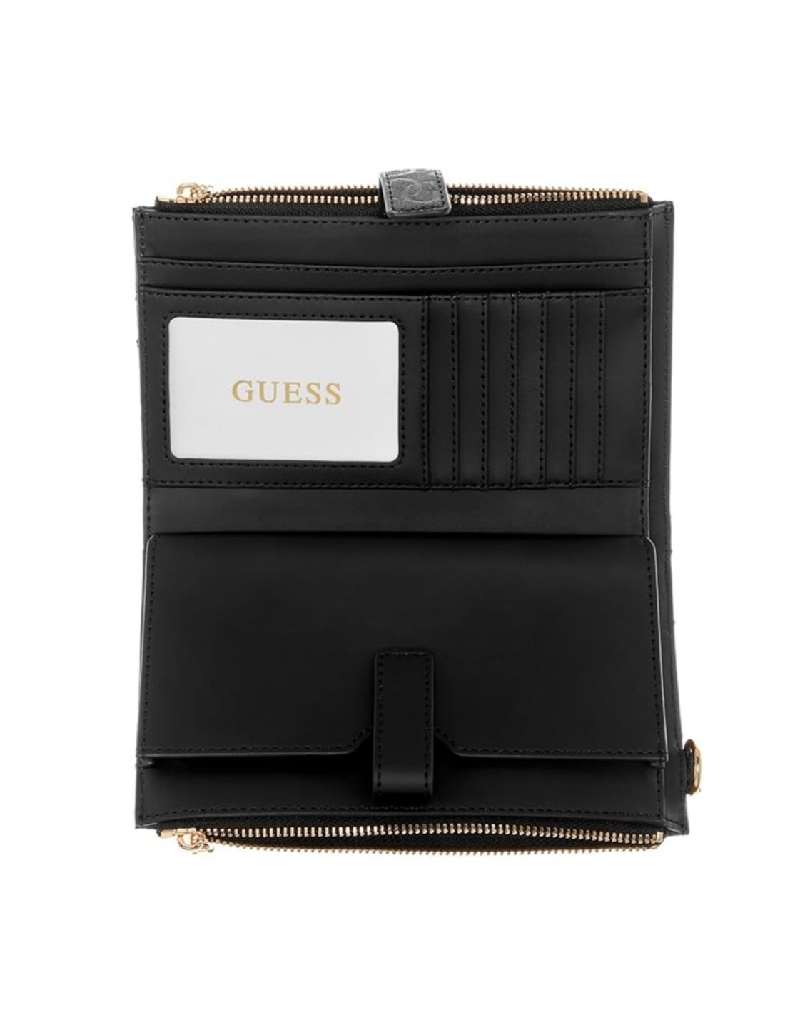 Este versátil monedero y portamóvil de Guess ofrece múltiples maneras de usarlo, ya sea como cartera o como bolso de mano. Cuenta con un compartimiento principal con divisiones para tarjetas de crédito y un doble bolsillo monedero con cremallera. El logotipo triángulo de metal frontal le da un toque elegante y distintivo.