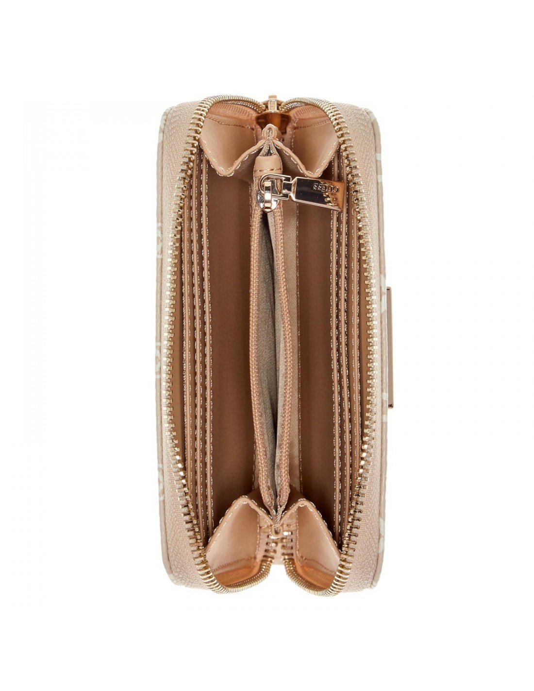 Exterior de piel sintética. Destaca por su cierre con cremallera y piezas metálicas color dorado pálido.