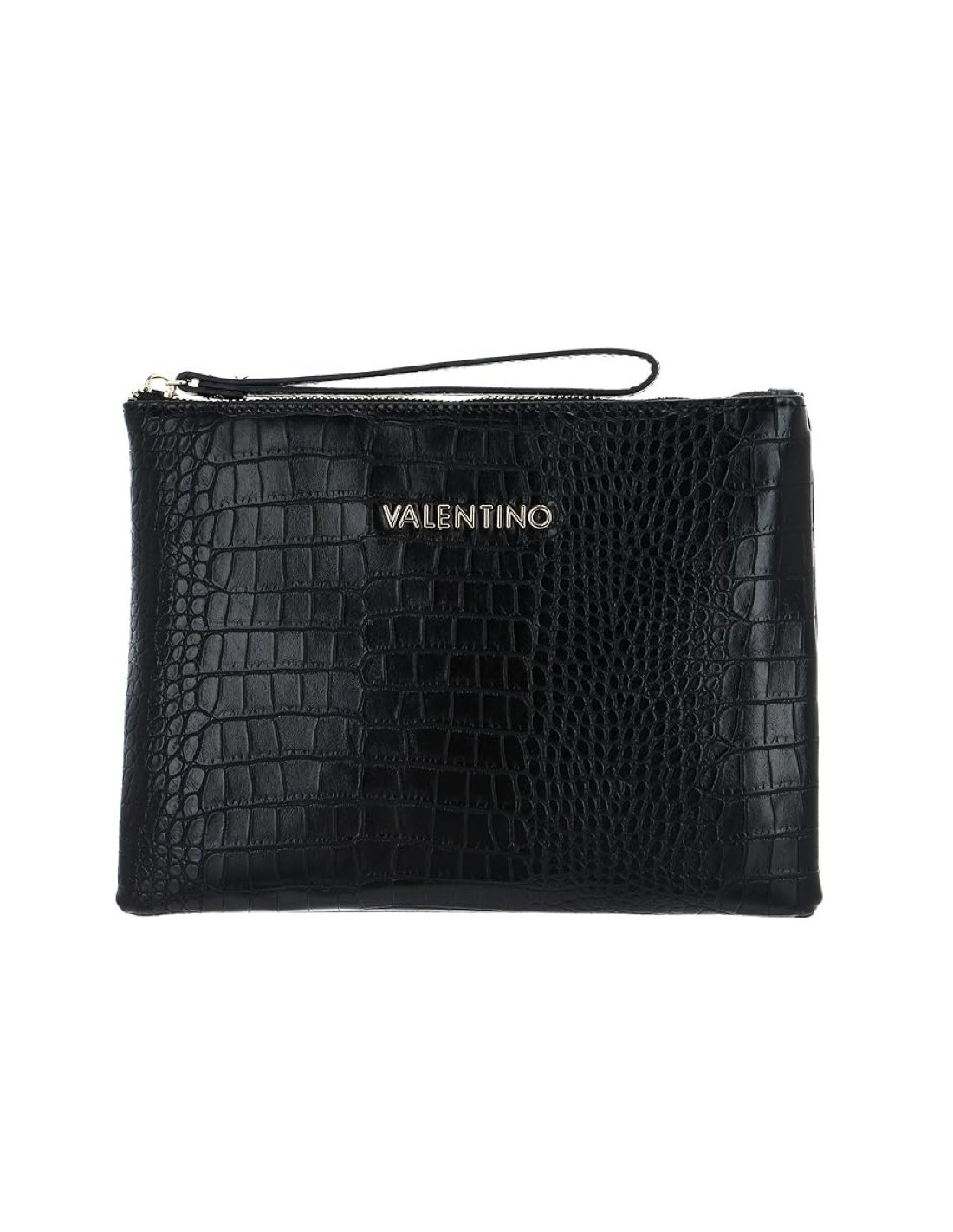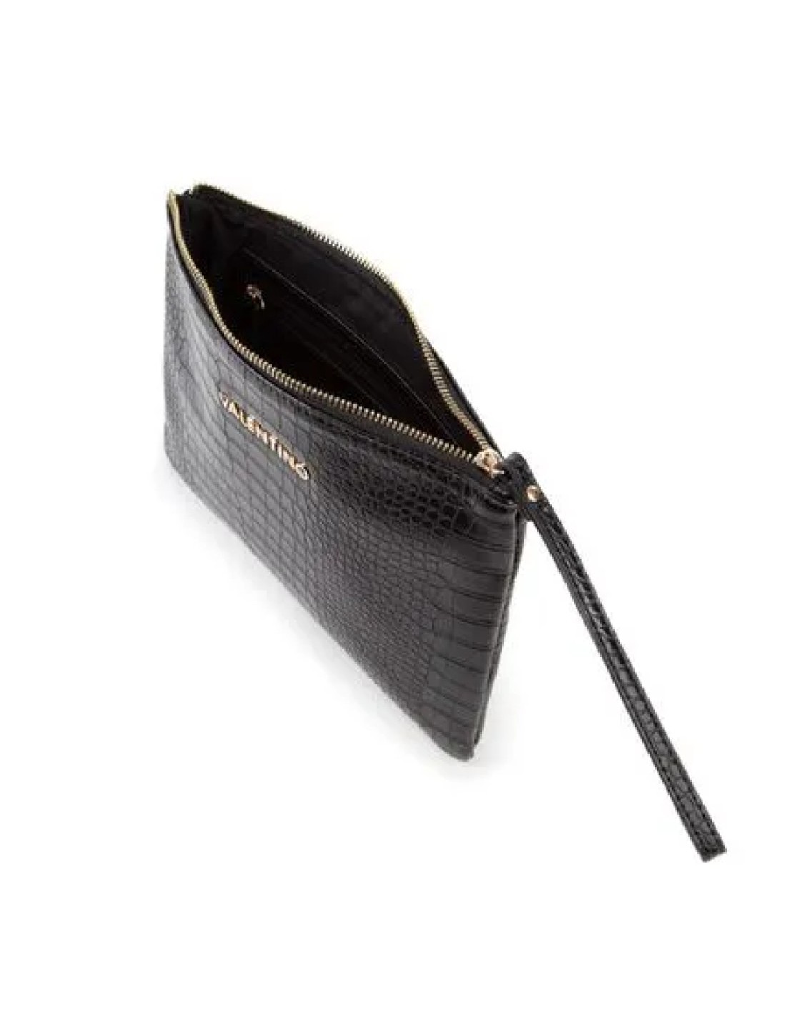 El bolso clutch Valentino Bags está confeccionado en poliuretano negro imitando la piel de cocodrilo y delicado logo en plateado en su frontal.