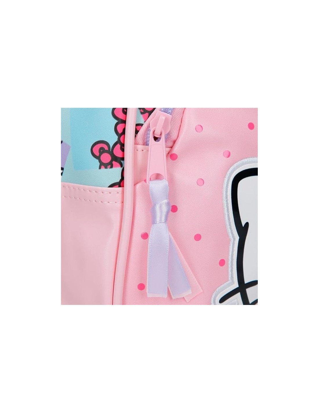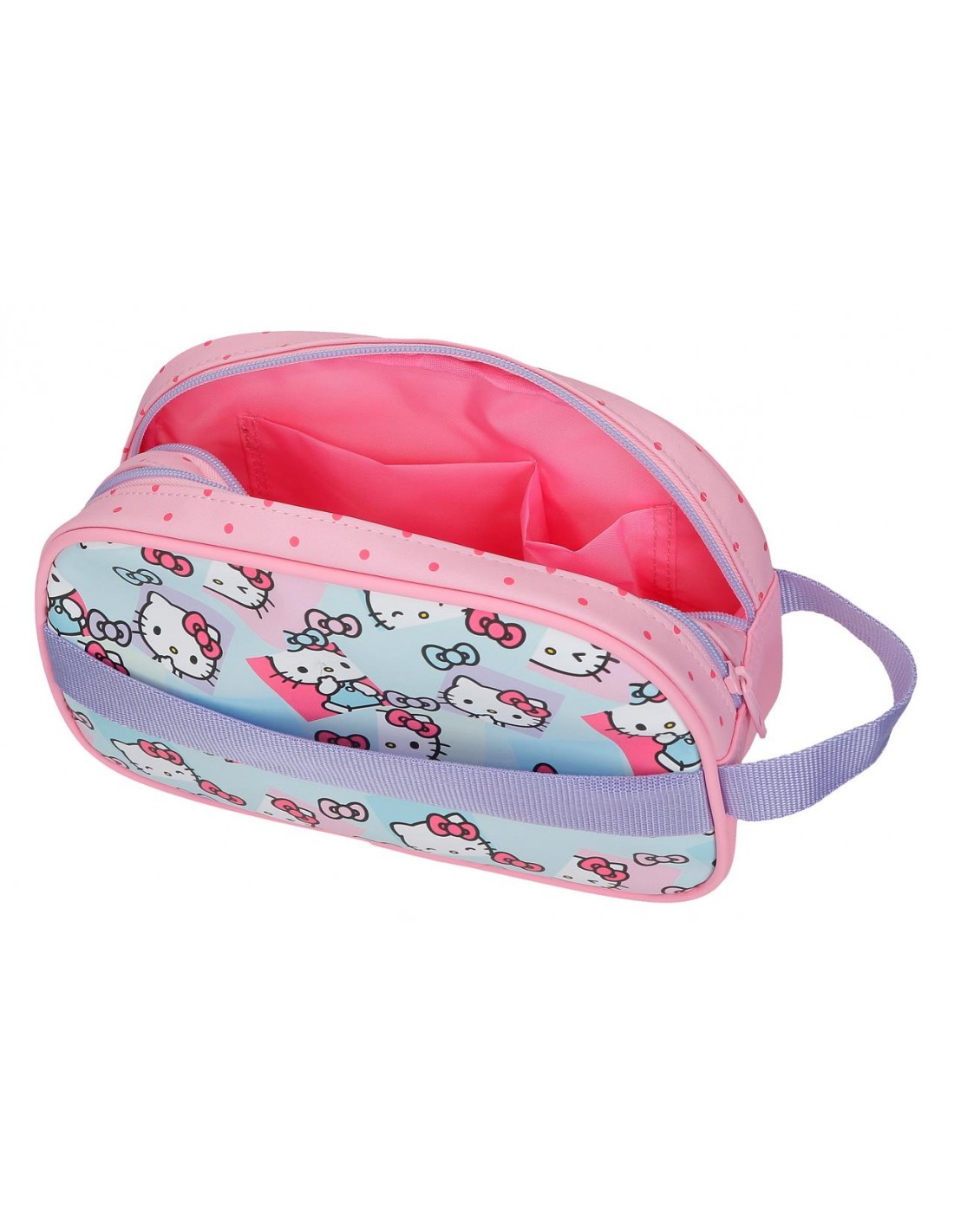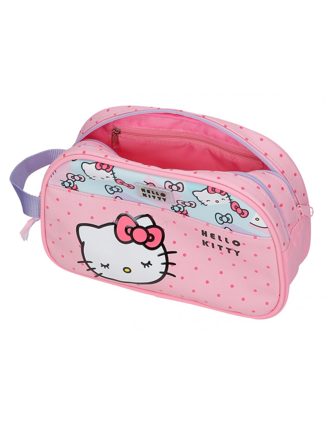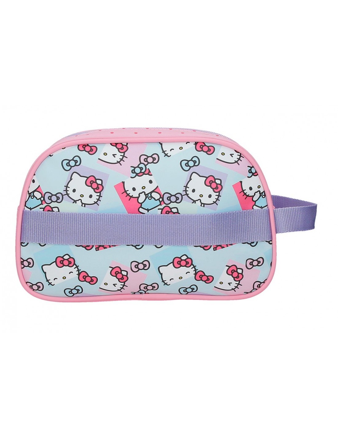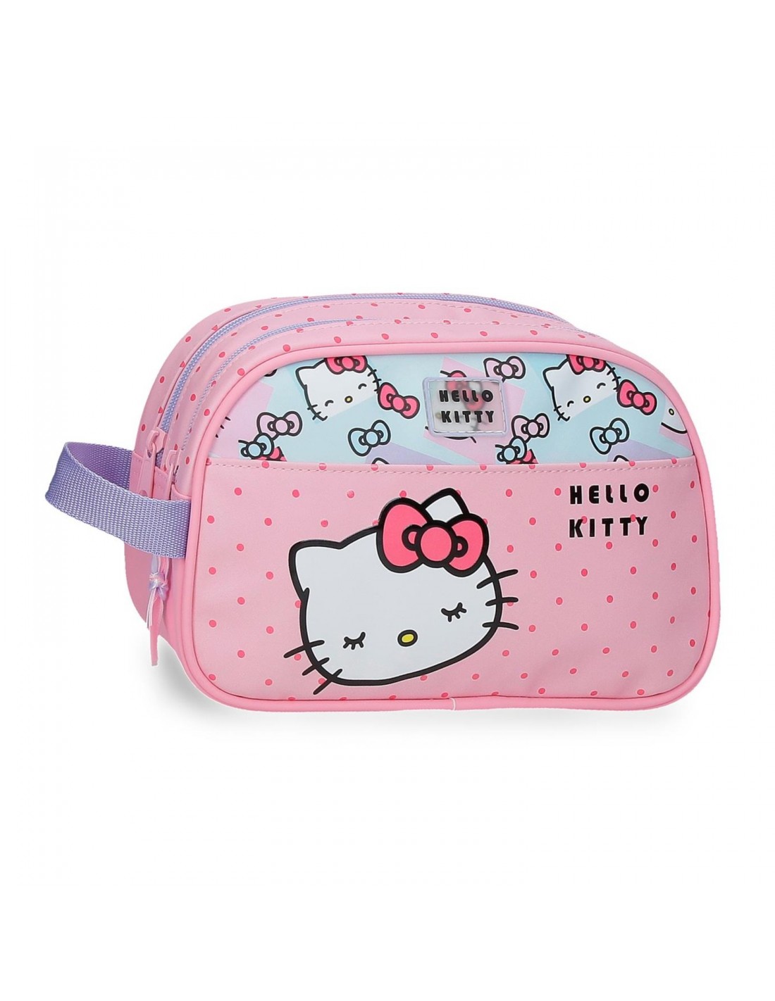 Neceser de 26 cm x 16 cm x 11 cm fabricado en Poliéster, con un detalle especial de la marca Hello Kitty en la parte frontal.