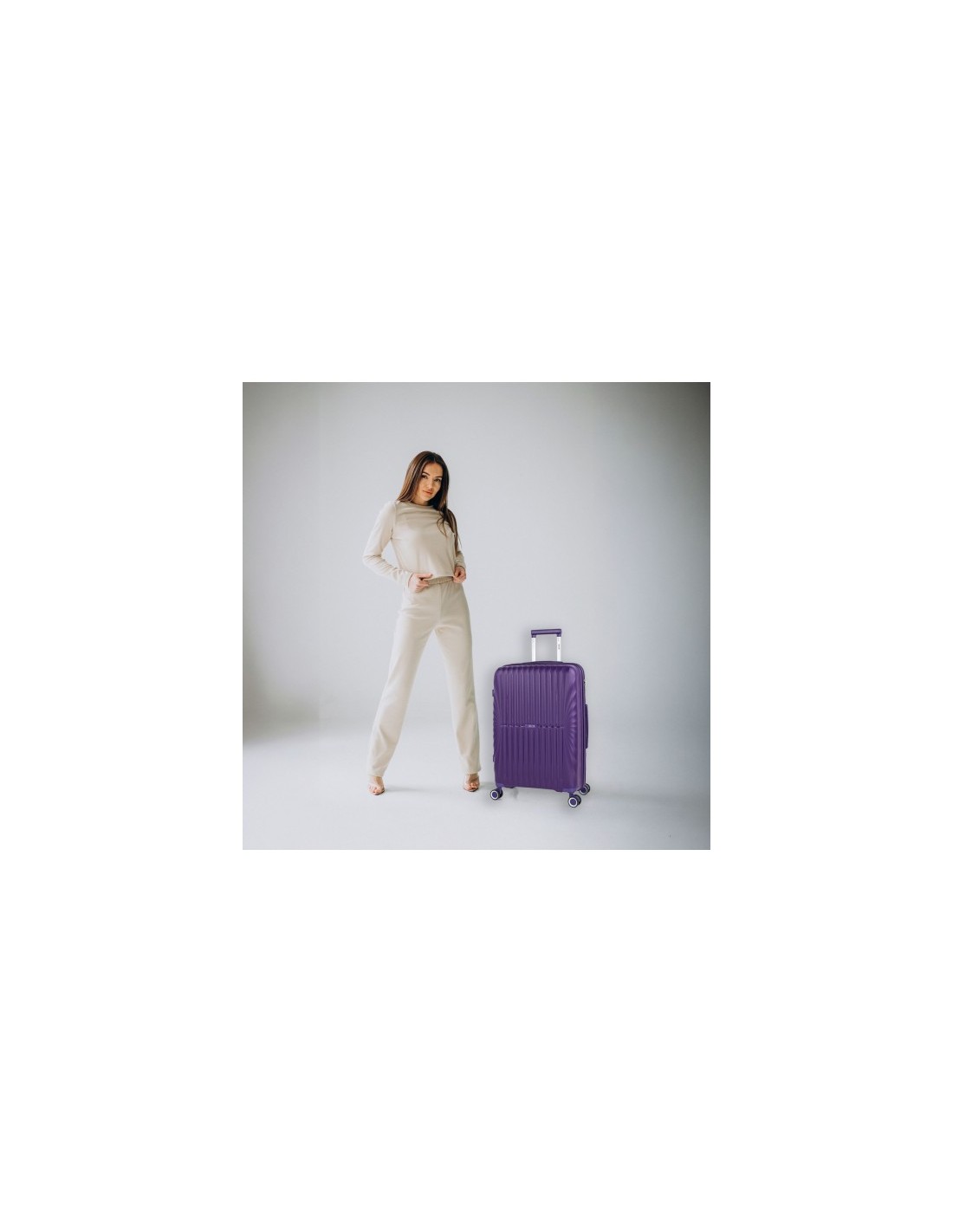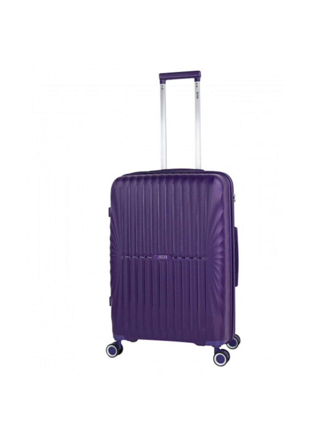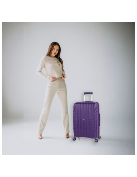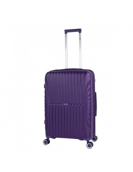 Una maleta mediana que ofrece espacio adicional para equipaje voluminoso. Destaca por su resistencia a los golpes y su diseño elegante en color morado.