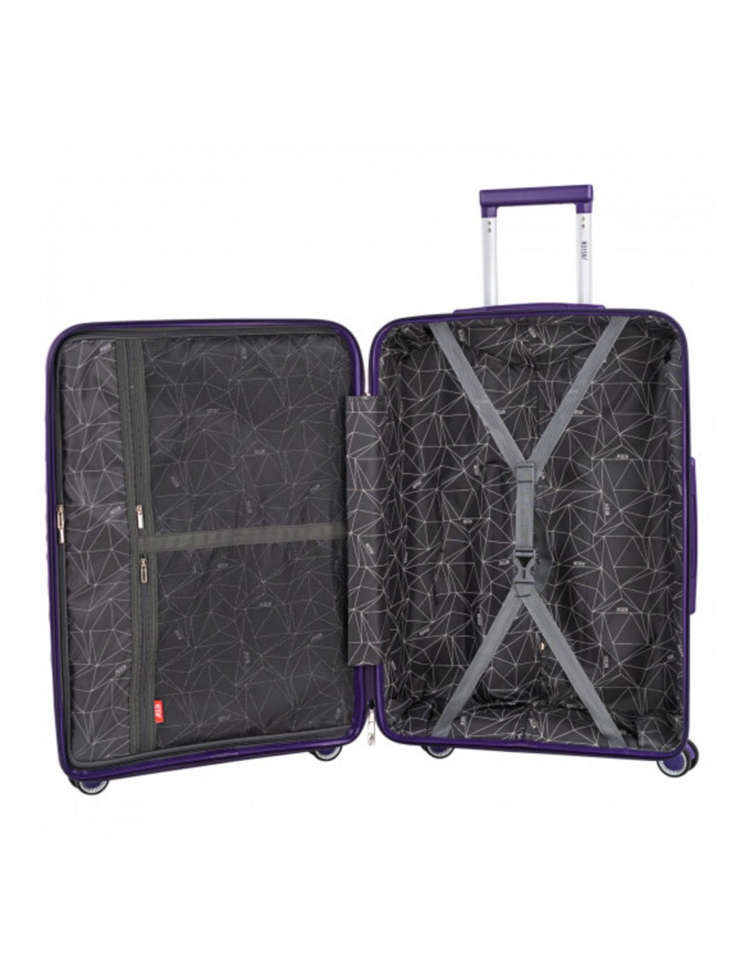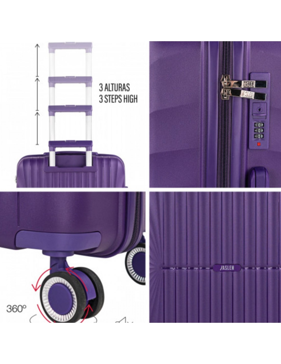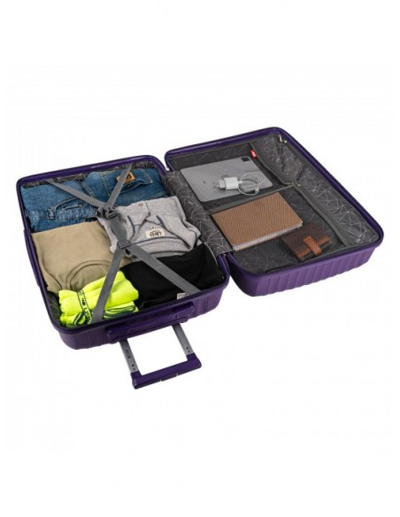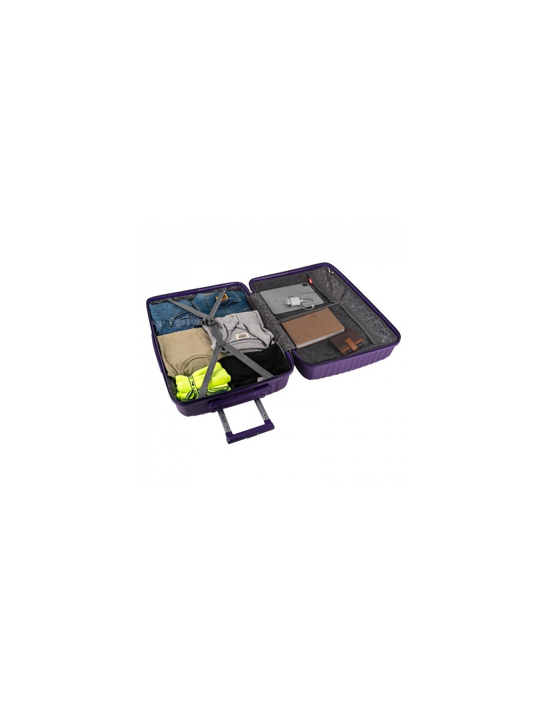 Una maleta mediana que ofrece espacio adicional para equipaje voluminoso. Destaca por su resistencia a los golpes y su diseño elegante en color morado.