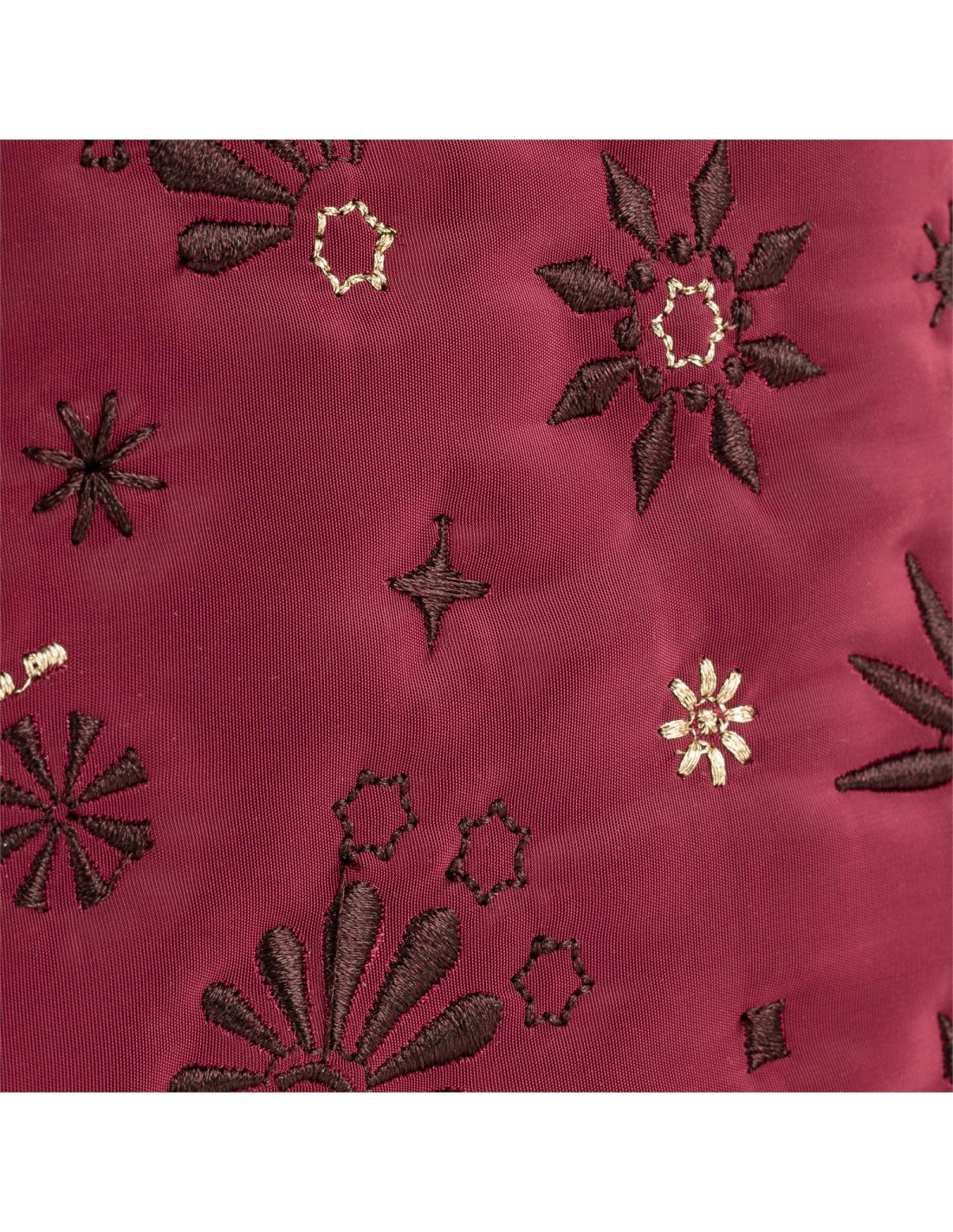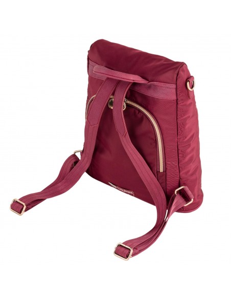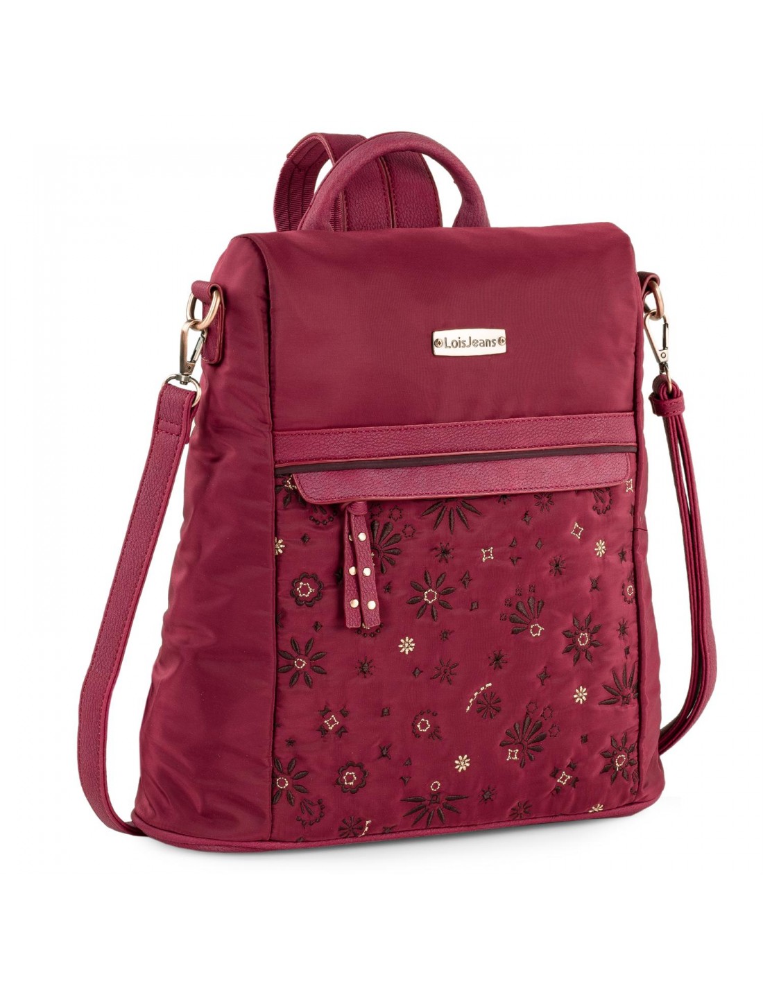Fabricado en una bonita combinación de nylon/polipiel, material resistente y ligero combinado con lona en tonos granates con detalles bordados. Gracias a sus muchos detalles es ideal para sacar lo mejor a tus looks.