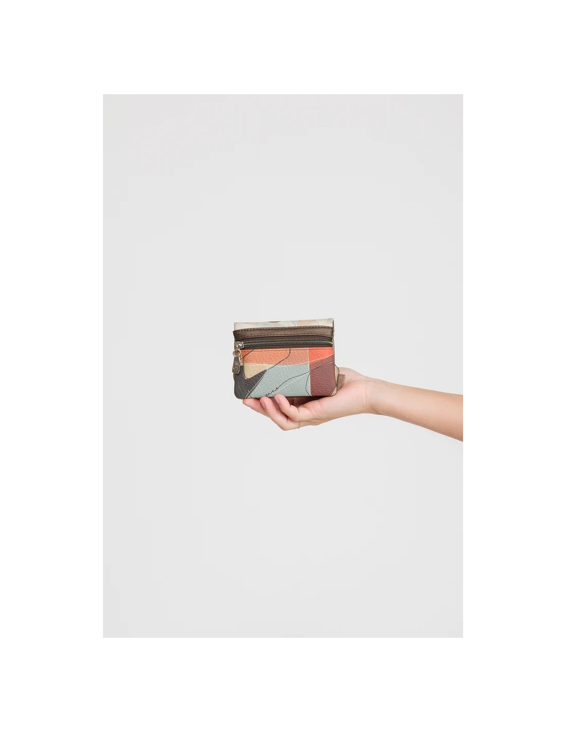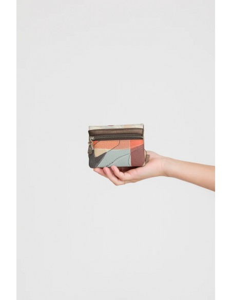 Sophia es un homenaje a la sabiduría: su nombre evoca a Hipatia de Alejandría. Esta cápsula juega con geometría, simetría, grabados lineales y efectos brillantes. En tonos azul grisáceo, blanco roto, beige y verdes metálicos, Sophia combina elegancia intelectual y delicadeza estética, invitando a vestirse con sentido y belleza. Monedero Anekke con cierre de solapa en tonos multicolor.