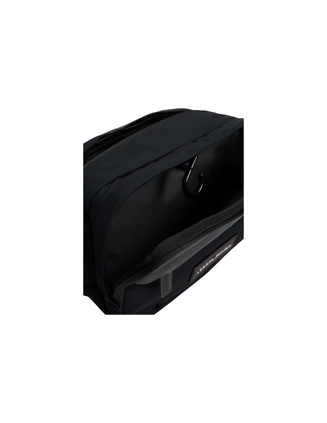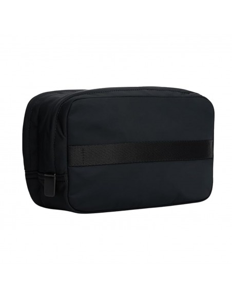 Este neceser, ideal para tener los productos de aseo a mano, está fabricado con un acabado liso y destaca por su cinta distintiva y un parche con el logo metálico en la parte delantera.