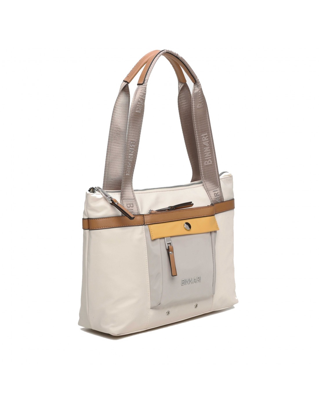 Confeccionado en nylon reciclado y pu de alta calidad, el Shopper Doble Asa Binnari Genil en color hielo destaca por su gran capacidad de organización y sus detalles metálicos en nickel.