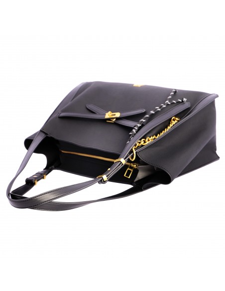 • detalle decorativo frontal de correa y colgante de cadena con logo