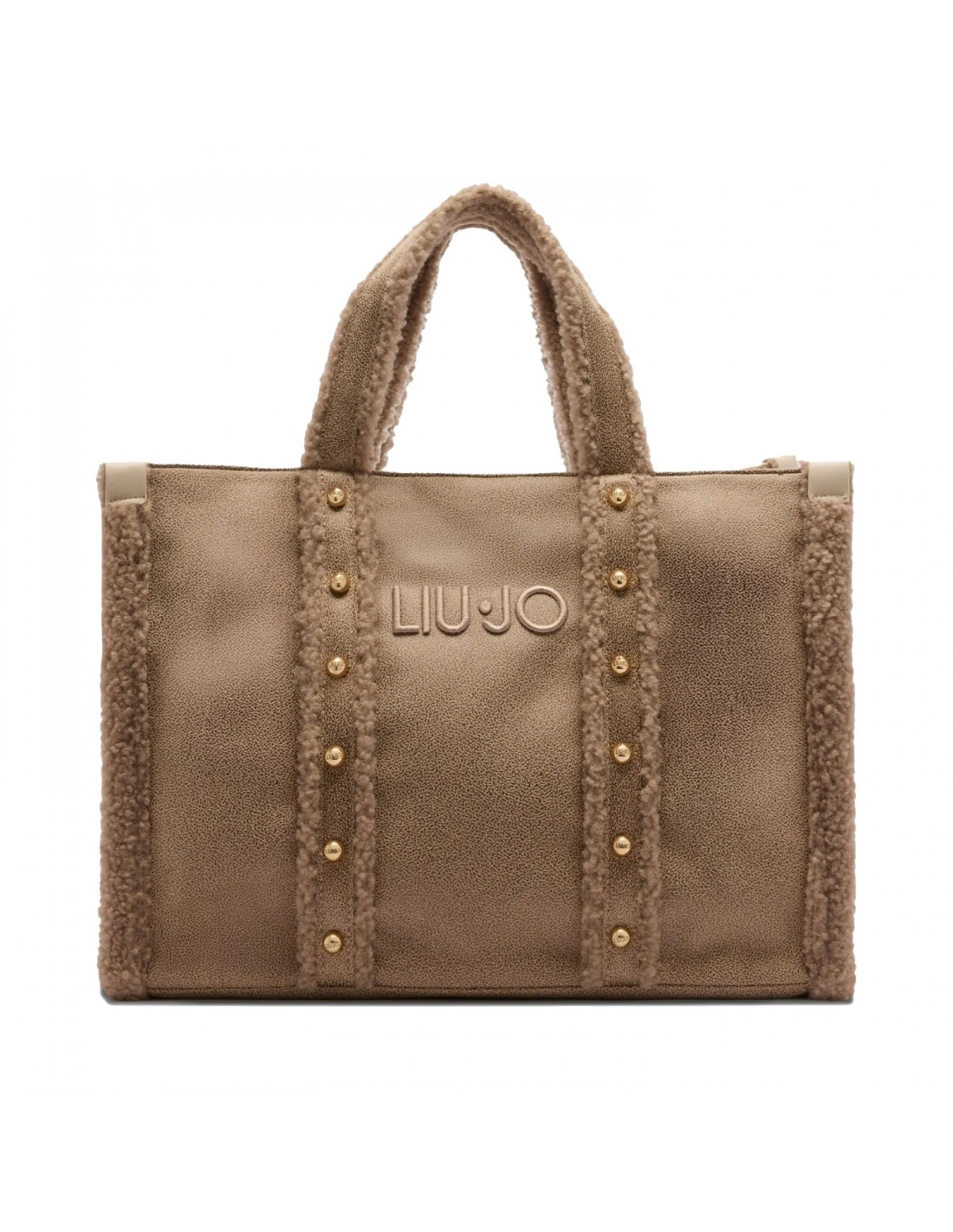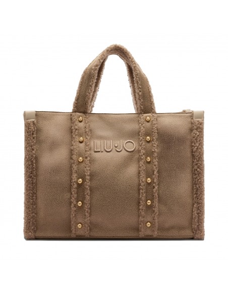 Fabricado en tejido revestido efecto borreguillo, el Bolso Tote Liu Jo Monogram en color natural destaca por sus detalles de peluche, logotipo bordado y aplicaciones de tachuelas que le dan un toque elegante y sofisticado.