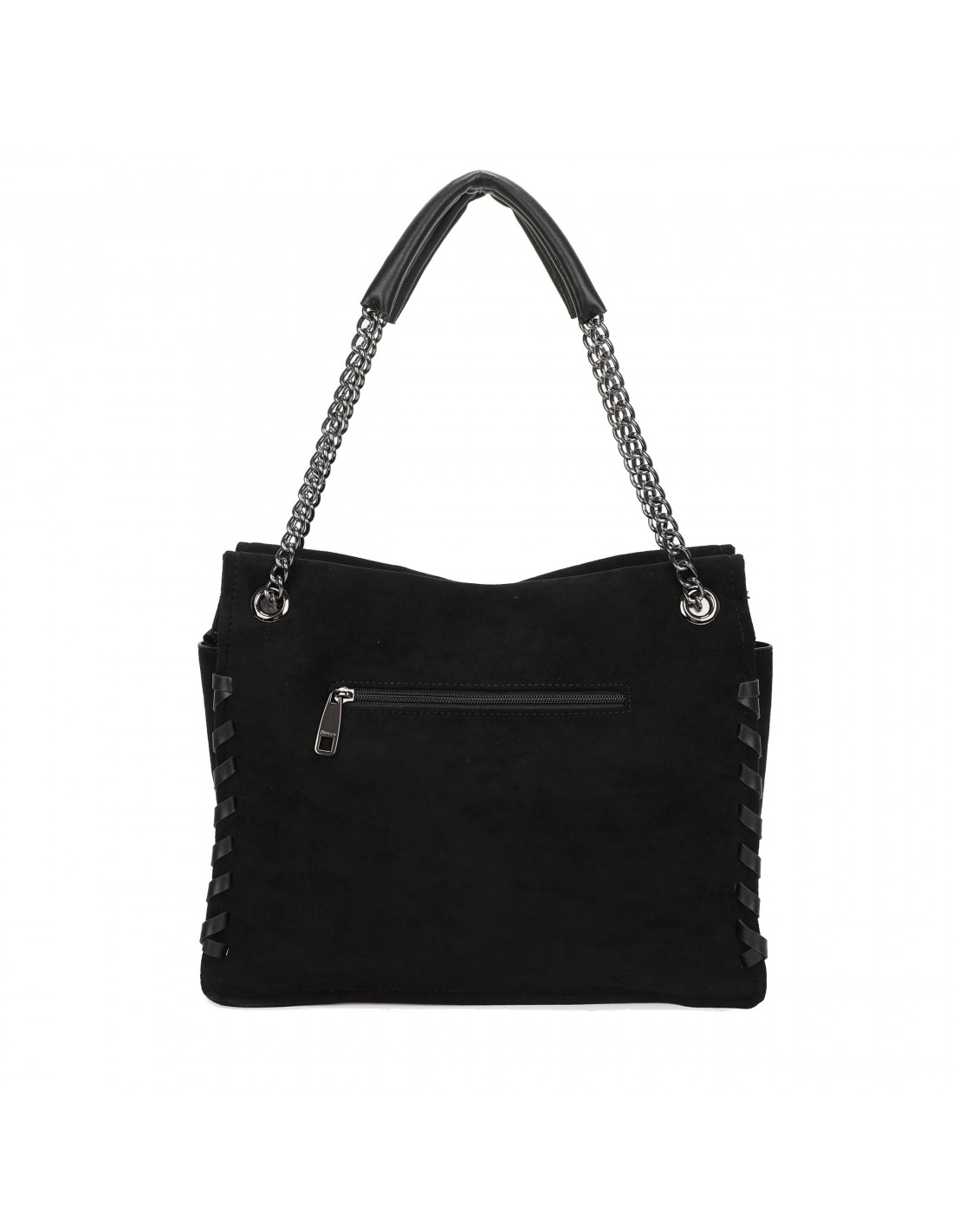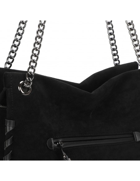 Este bolso está confeccionado en antelina de alta calidad, con detalles en pu y asa trenzada combinada con eslabones metálicos, lo que le otorga un toque especial y elegante.