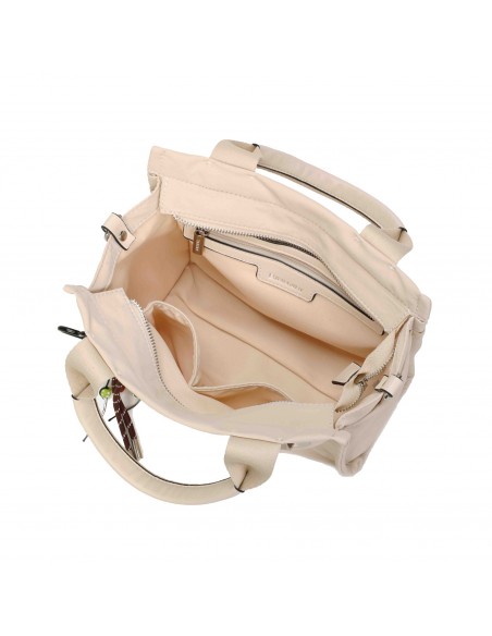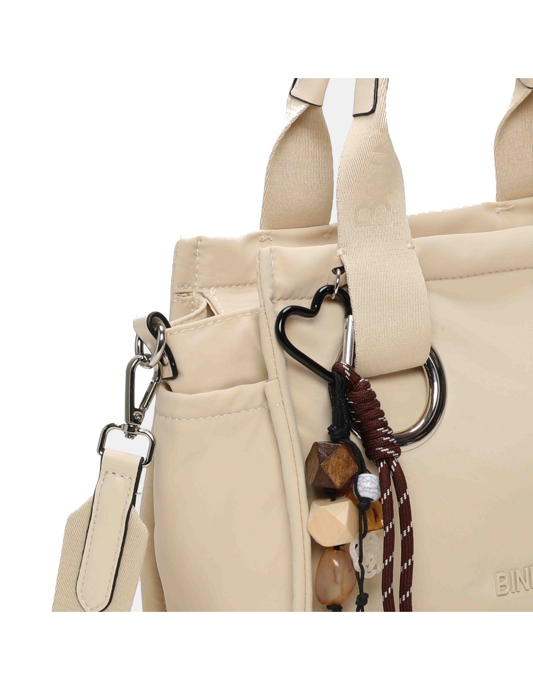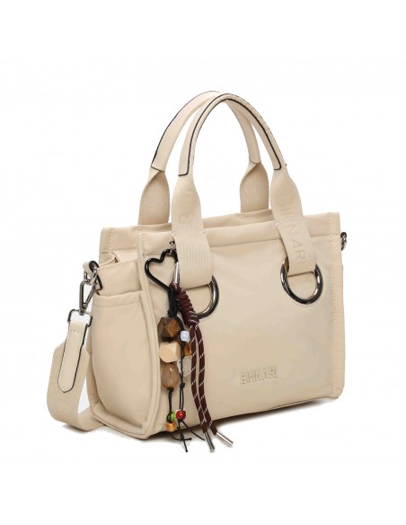 El bolso más vendido de toda la colección conquista por su diseño práctico, moderno y súper favorecedor. Fabricado en nylon resistente, combina asas anchas con aros metálicos que le dan un toque muy actual. Incluye un detalle decorativo extraíble y una correa regulable para usarlo también en bandolera. Compacto pero espacioso, es ese modelo que lo tiene todo: estilo, comodidad y funcionalidad. ¡Un auténtico imprescindible!