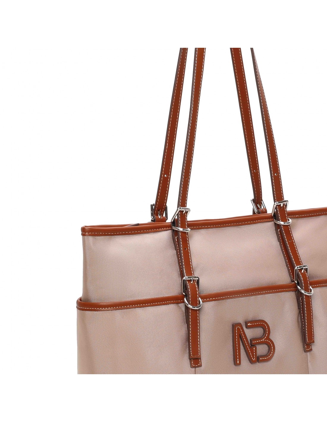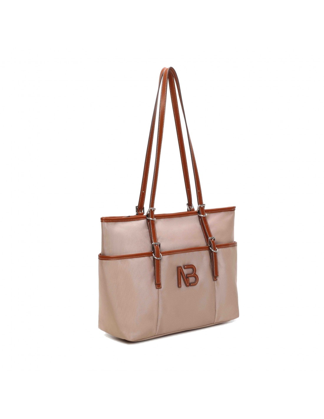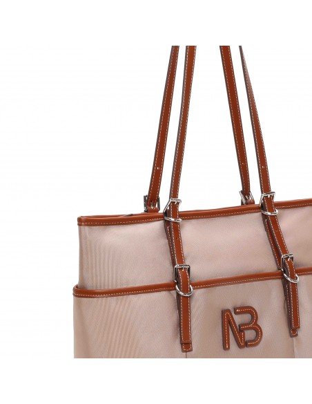 Confeccionado con un material técnico resistente, este shopper Binnari Zinia destaca por sus detalles y acabados en PU que realzan su diseño. El logo NB aplicado en PU en el frontal le aporta un toque distintivo y elegante.