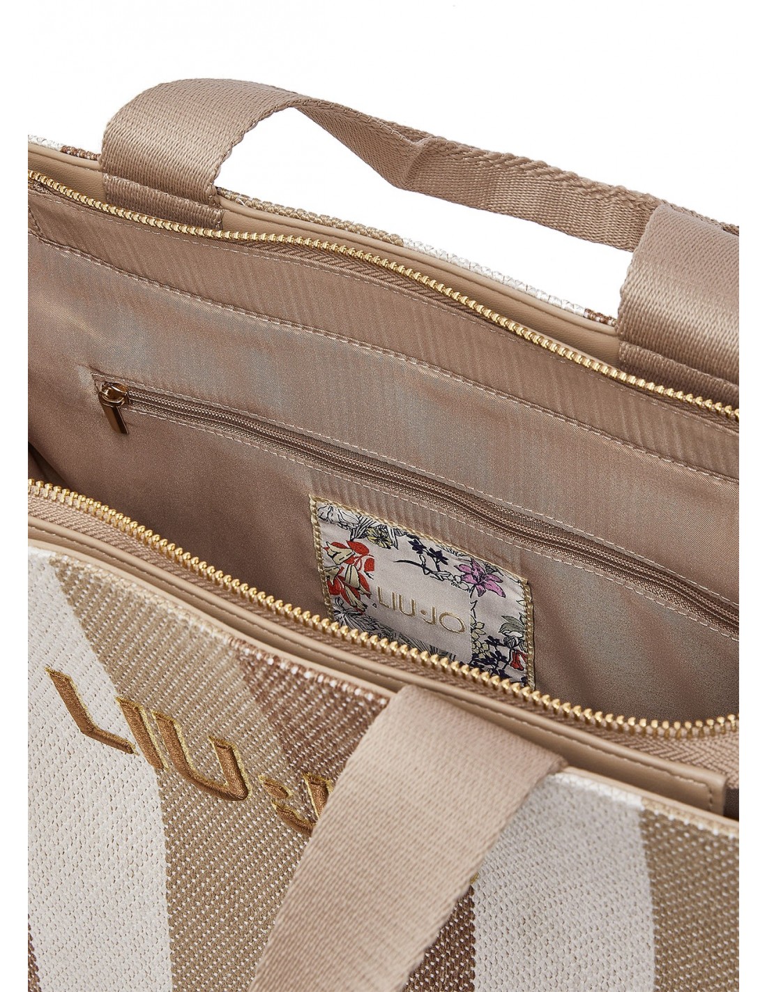 Una bolsa tote de gran tamaño elaborada en lona con un detalle especial de motivo de rayas y el distintivo logotipo de Liu-Jo.
