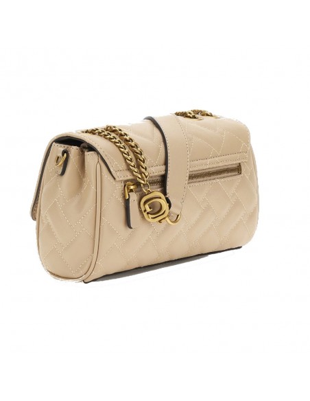 El bolso de hombro Guess Gracelynn está confeccionado en poliuretano en tono beige con diseño integral de pespuntes, herrajes y doble cadena corta con logotipo en dorado pulido.