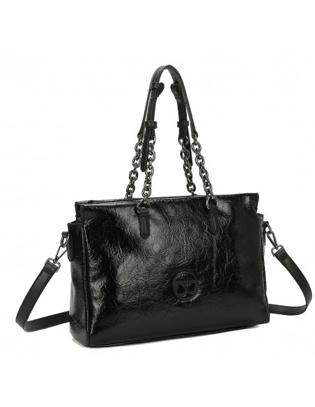 Versátil ya que podrás lucirlo como bolso de hombro por su doble asa mix de PU y cadena y como bandolera por su asa larga ajustable en altura.