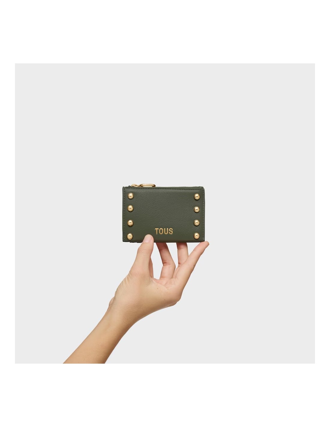 Monedero tarjetero TOUS Jewelry Studs de poliuretano en color caqui. Destaca por su compartimento especial para monedas con cierre de cremallera.