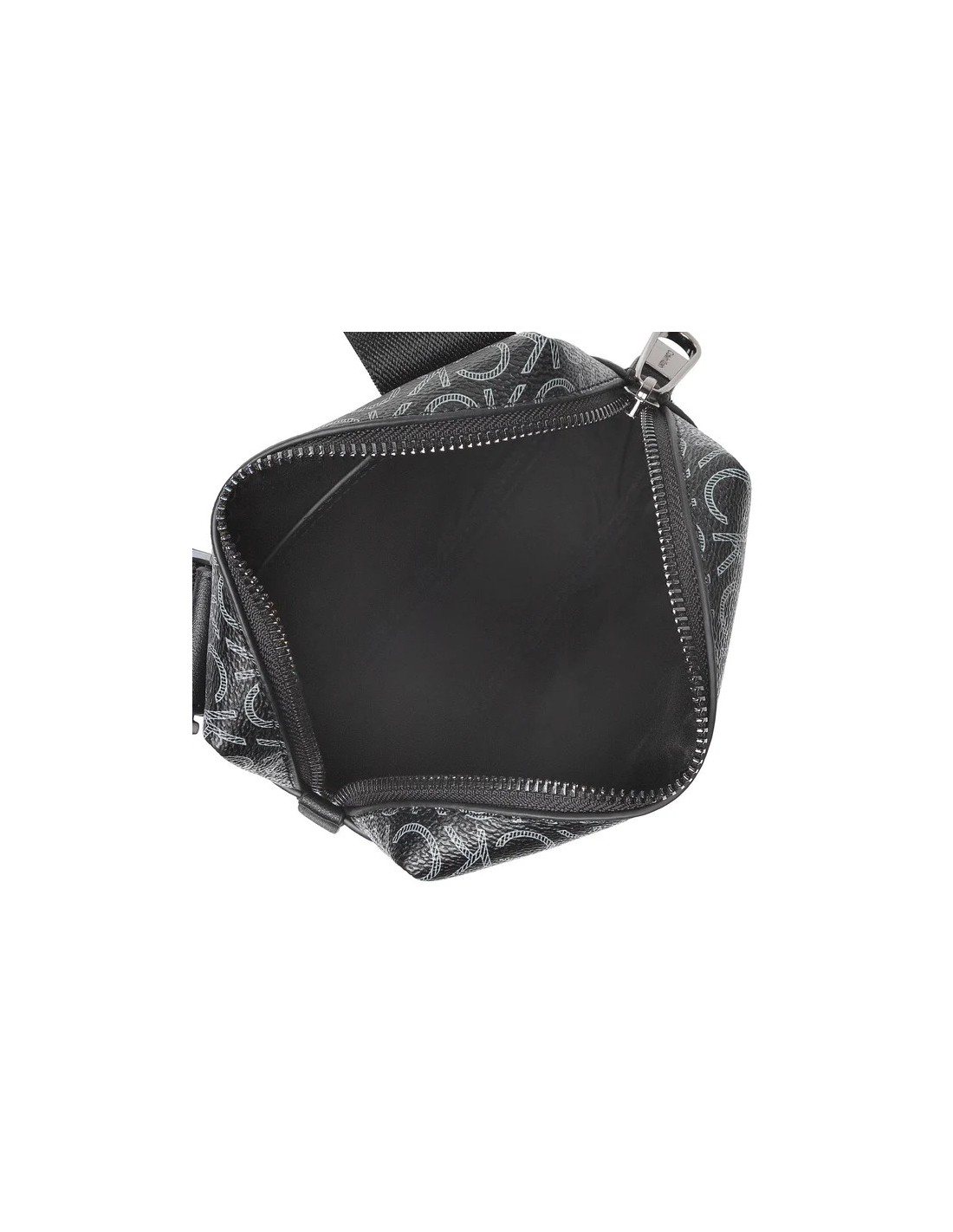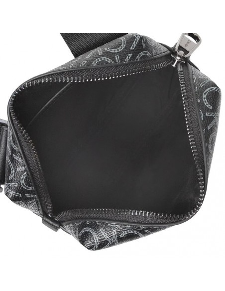 A bolsa tiracolo Calvin Klein Monogram apresenta um padrão integral de logótipos CK em contraste sobre fundo negro e logotipo metálico na parte frontal.