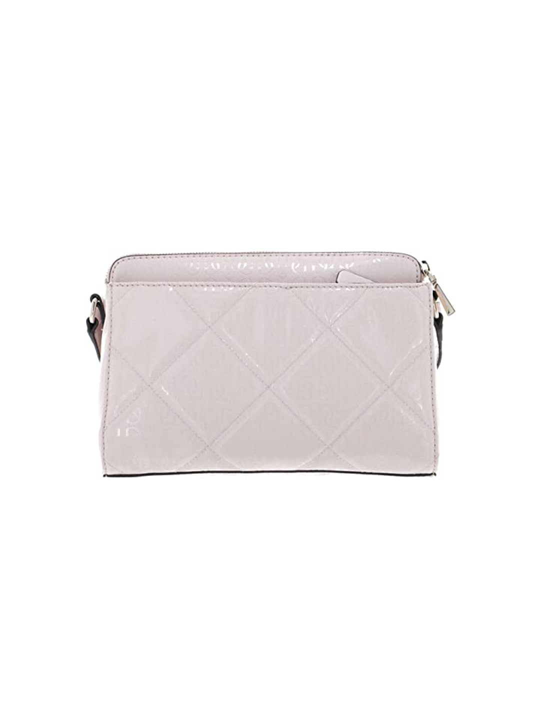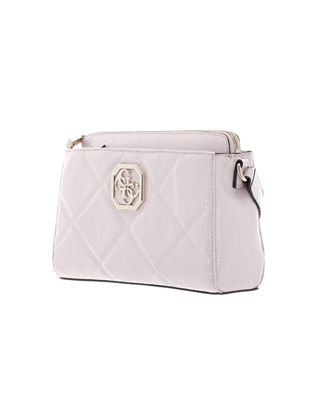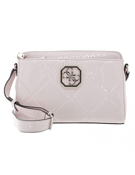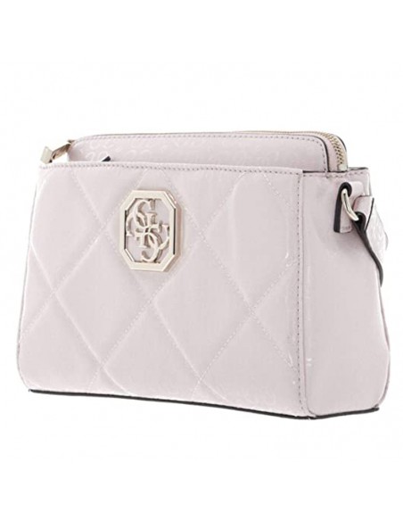 Bolso cruzado Guess Dilla confeccionado em material sintético com textura semi acolchoada numa delicada cor rosa palo com estampado de logotipo 4G por toda a superfície e elementos metálicos.