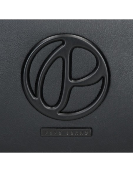 A bolsa Pepe Jeans Mara é confeccionada em pele sintética na cor preta e apresenta um grande logótipo frontal em relevo, entre outros distintivos da marca.