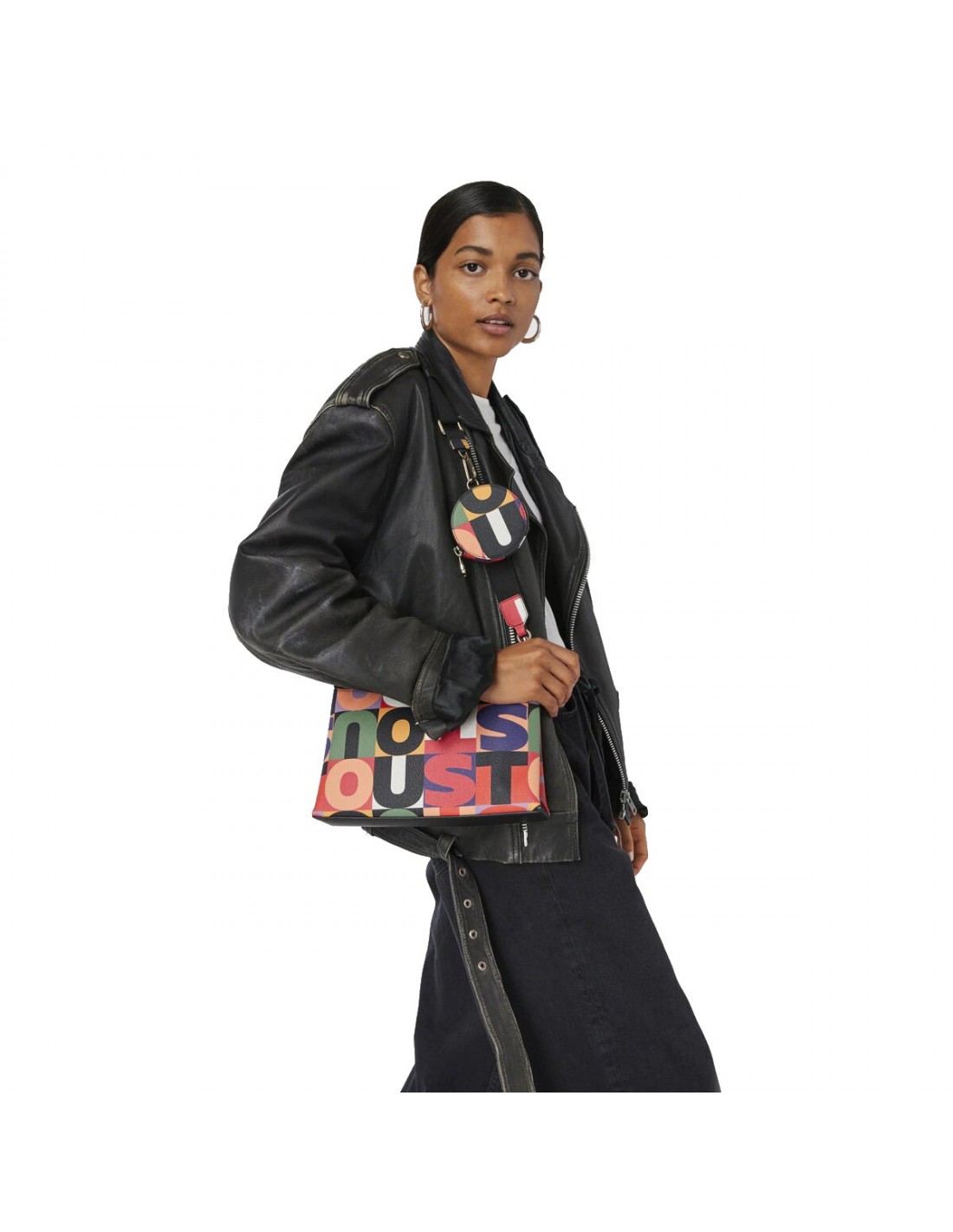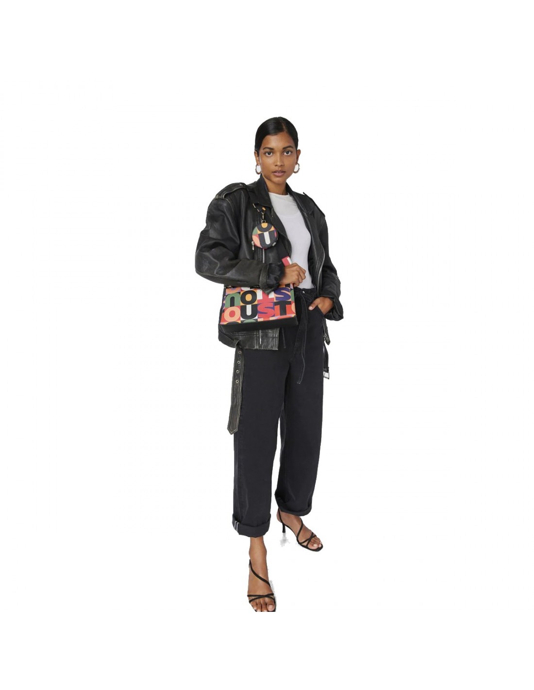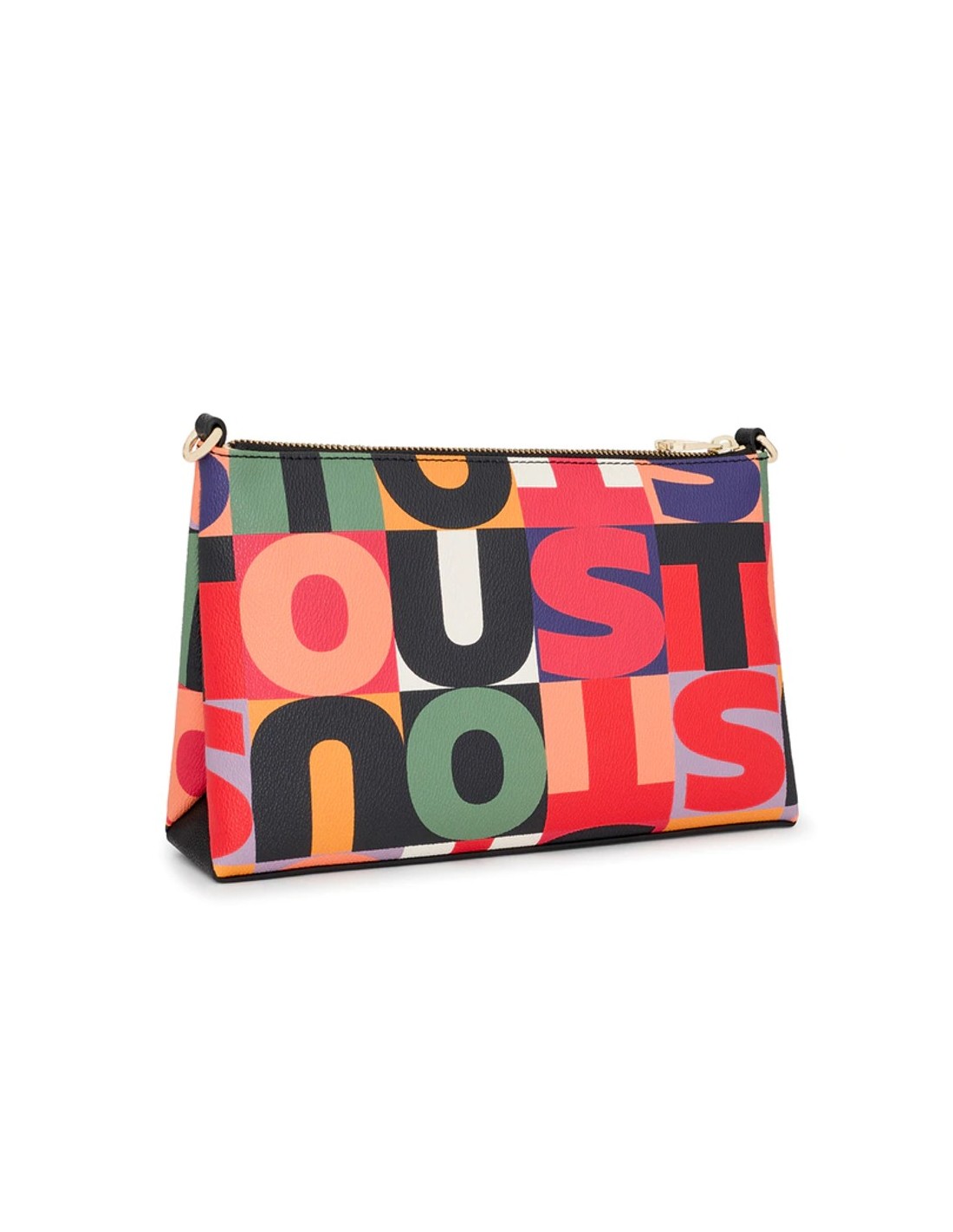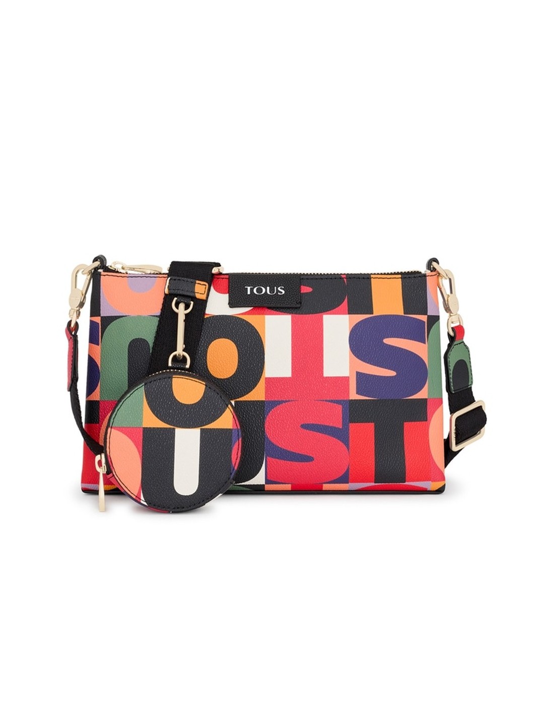 A bolsa tiracolo Flat Tous Mimic é confeccionada em lona estampada com logótipos multicolor e acabada com um vivo de pele sintética. Detalhe de etiqueta externa com logótipo.