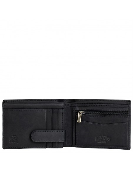 Esta carteira americana conta no seu interior com 10 slots para cartões ou documentos, 1 deles translúcido, compartimento duplo para notas e um porta-moedas fechado com fecho éclair.