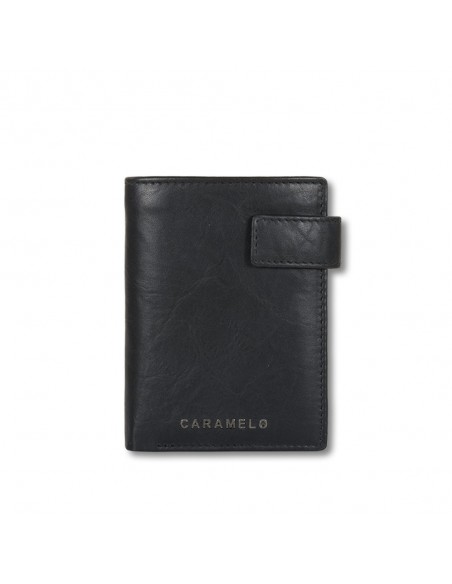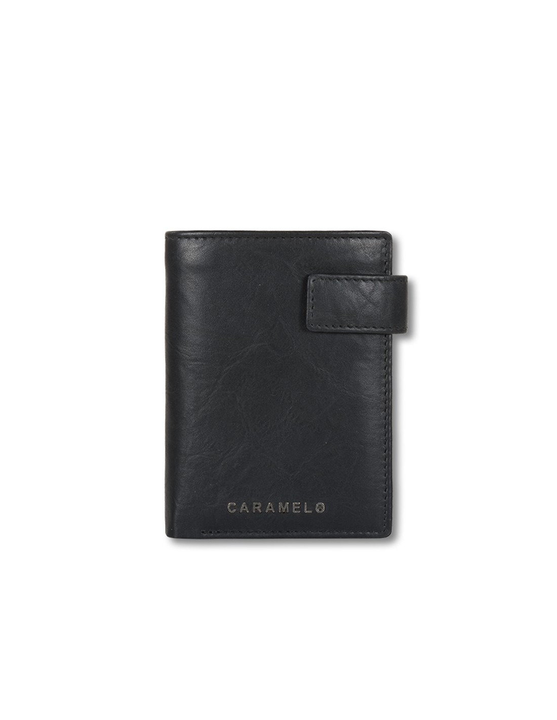 A carteira Caramelo Butler é confeccionada em pele na cor preta e apresenta um design elegante com fecho principal de mini aba e botão de pressão.