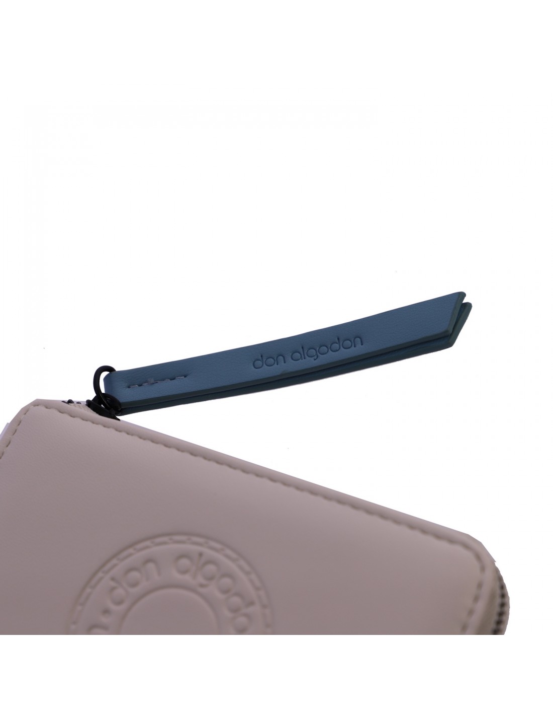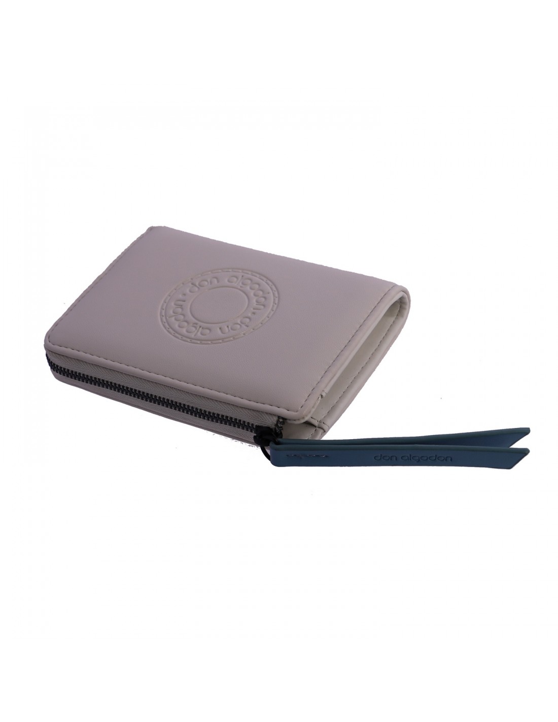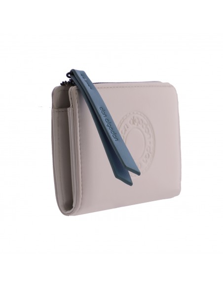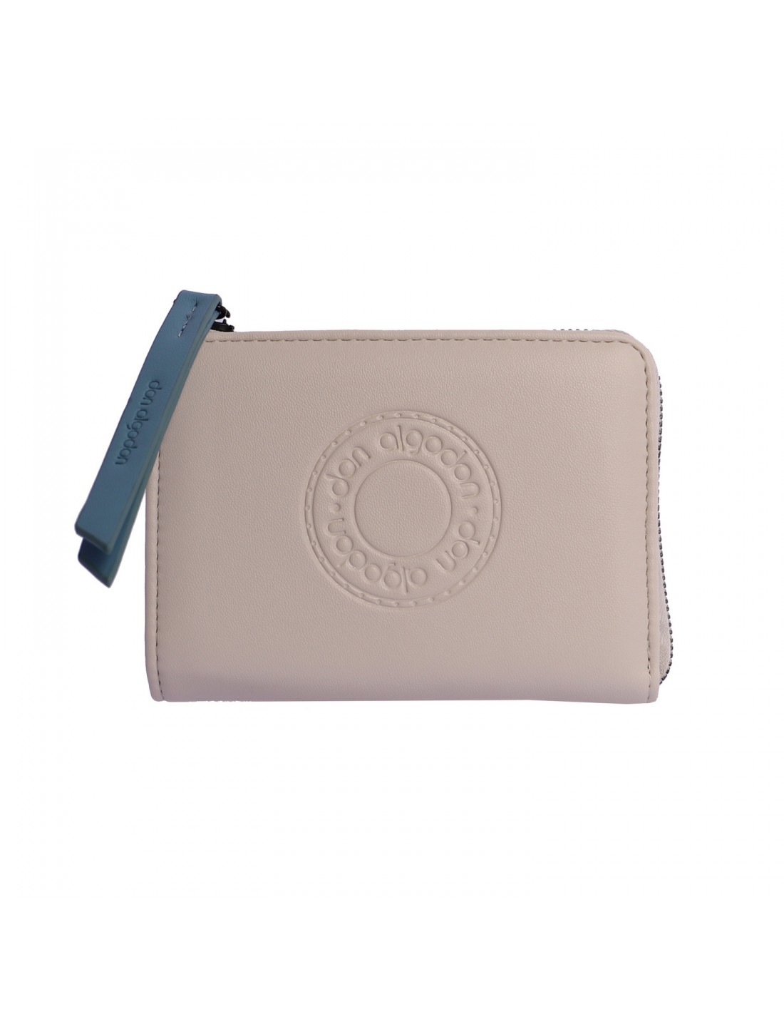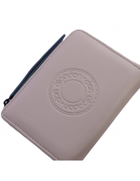 A carteira Logo é confeccionada em material sintético na cor bege e apresenta estampado na parte frontal com o logo da marca Don Algodón.