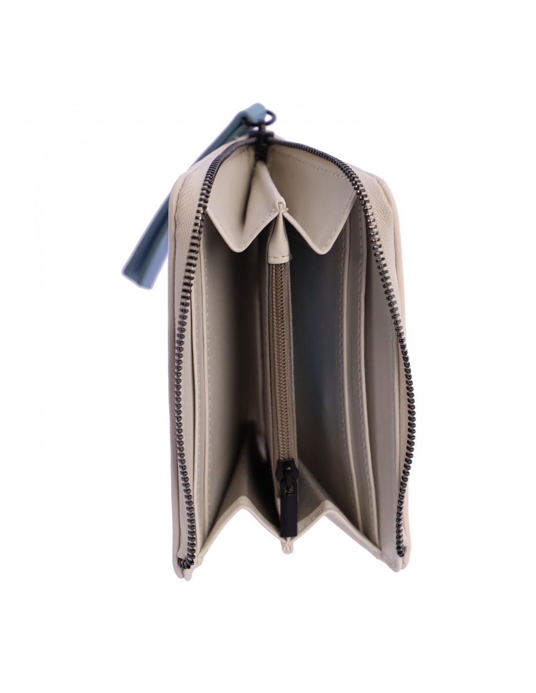 O seu fecho de correr principal com puxador colorido oculta um compartimento duplo para notas, papéis e bilhetes, um bolso central com fecho de correr e um porta-cartões com 4 ranhuras.