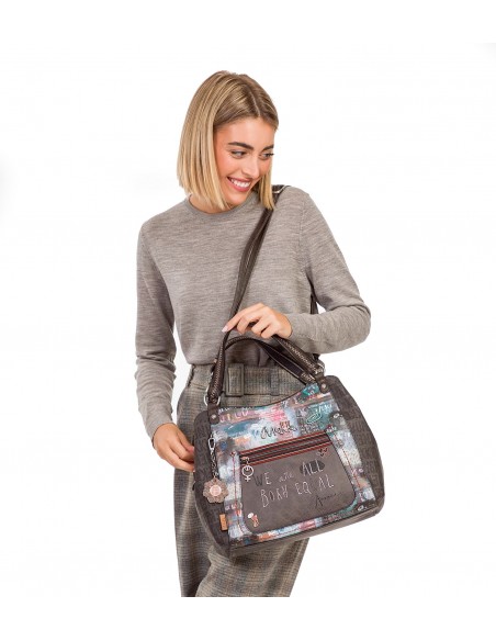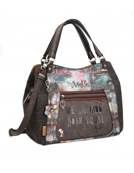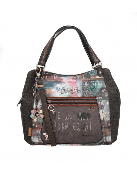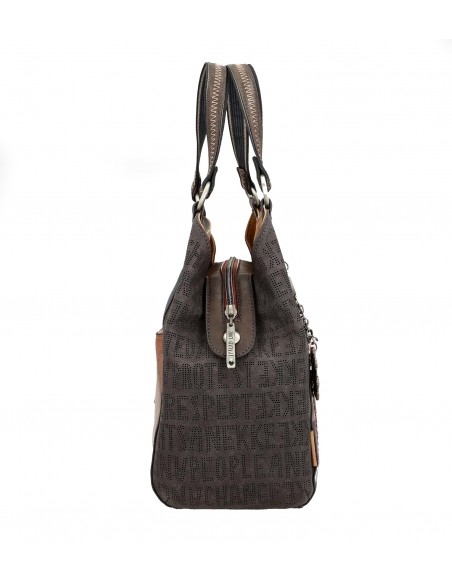 O bolso de mão Anekke Respect, Voice é confeccionado em PU amigo do ambiente, em tons ocres, cinzas, castanhos e azuis. O seu estampado principal combina diferentes mensagens de paz, amor e igualdade com motivos e desenhos. A parte traseira combina diferentes tons e um patch com mensagem da coleção.