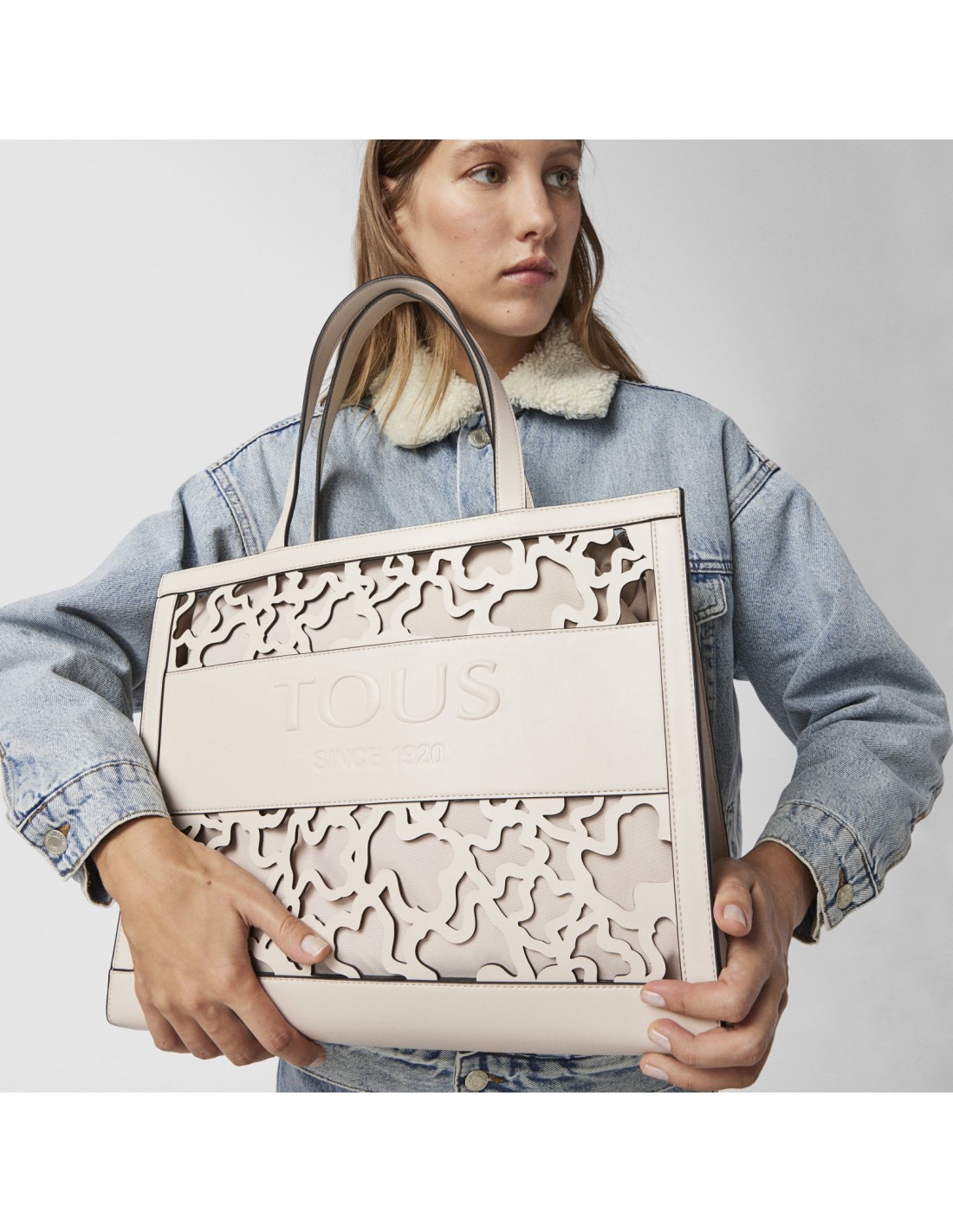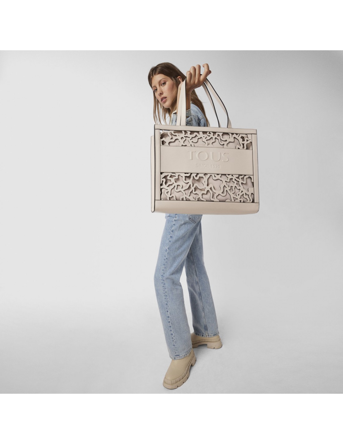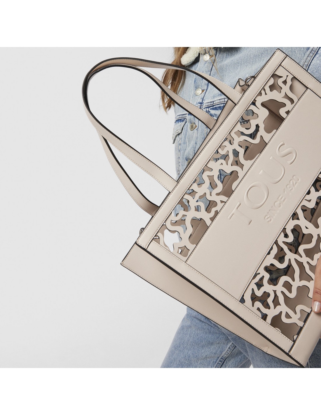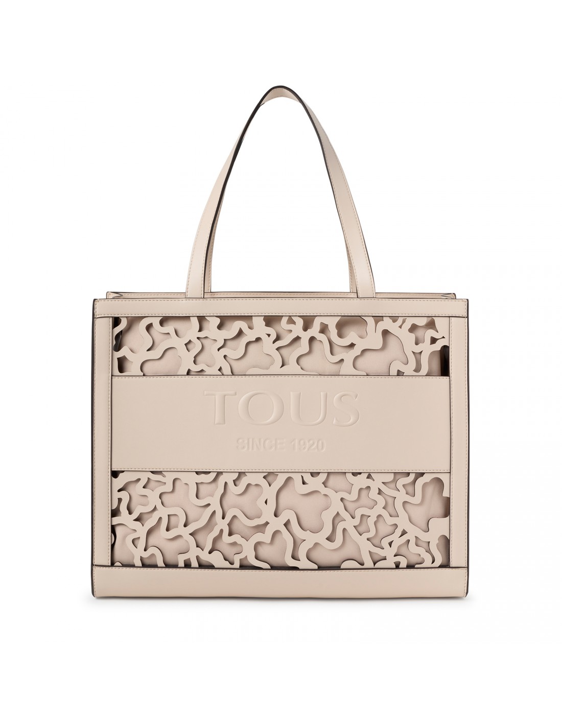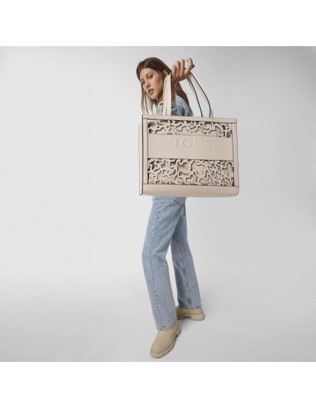 A bolsa shopping Tous Amaya Kaos Shock apresenta um tamanho grande, XL, e é confeccionada em vinil com efeito pele numa bonita tonalidade bege, com o adorável urso perfurado por toda a superfície.