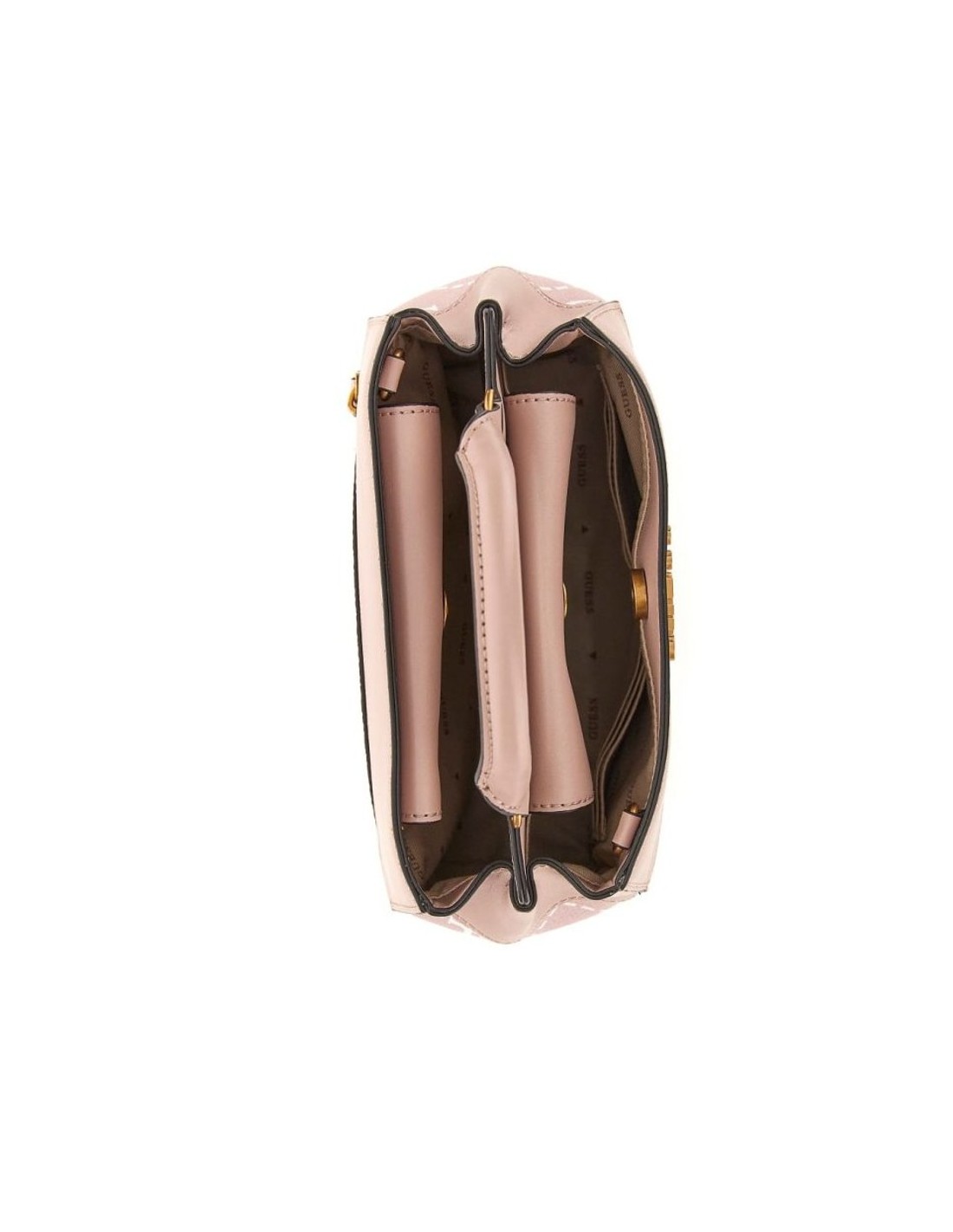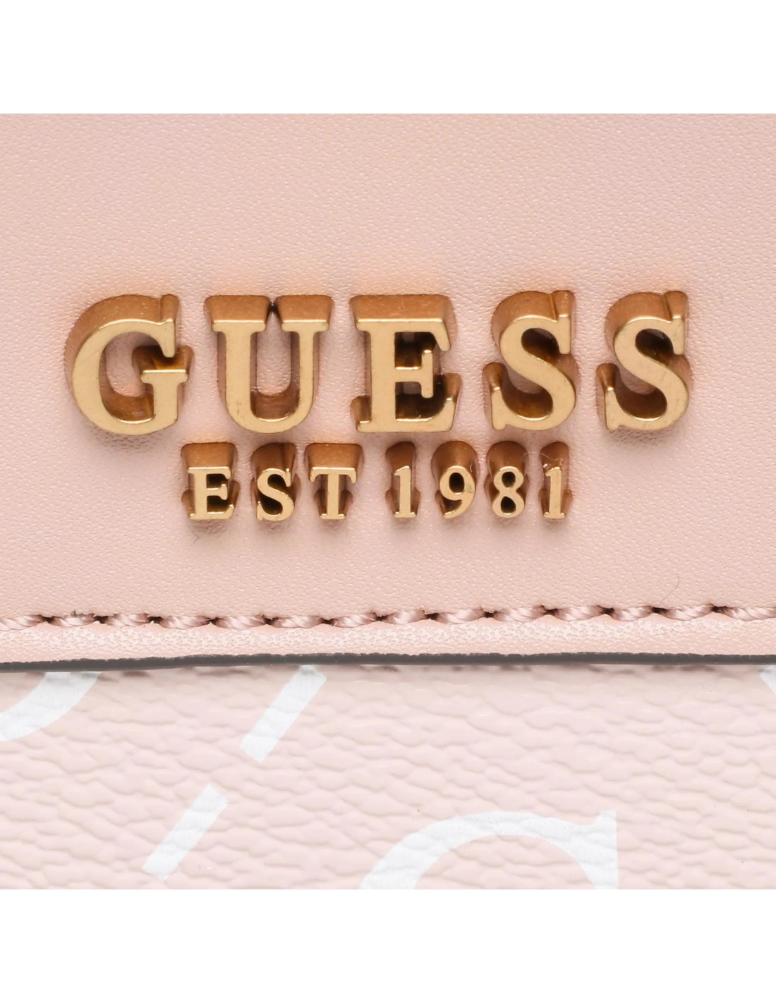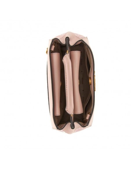 A balsa de mão Guess Berta com logótipos é confeccionada em poliuretano em tons rosados com logótipo peónia na sua superfície e logótipo metálico da marca na parte da frente.
