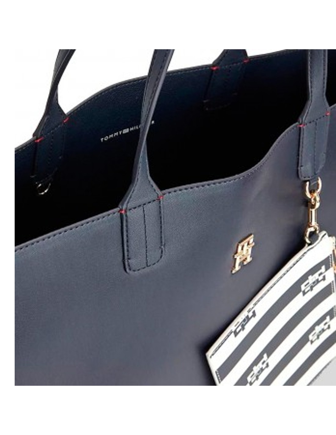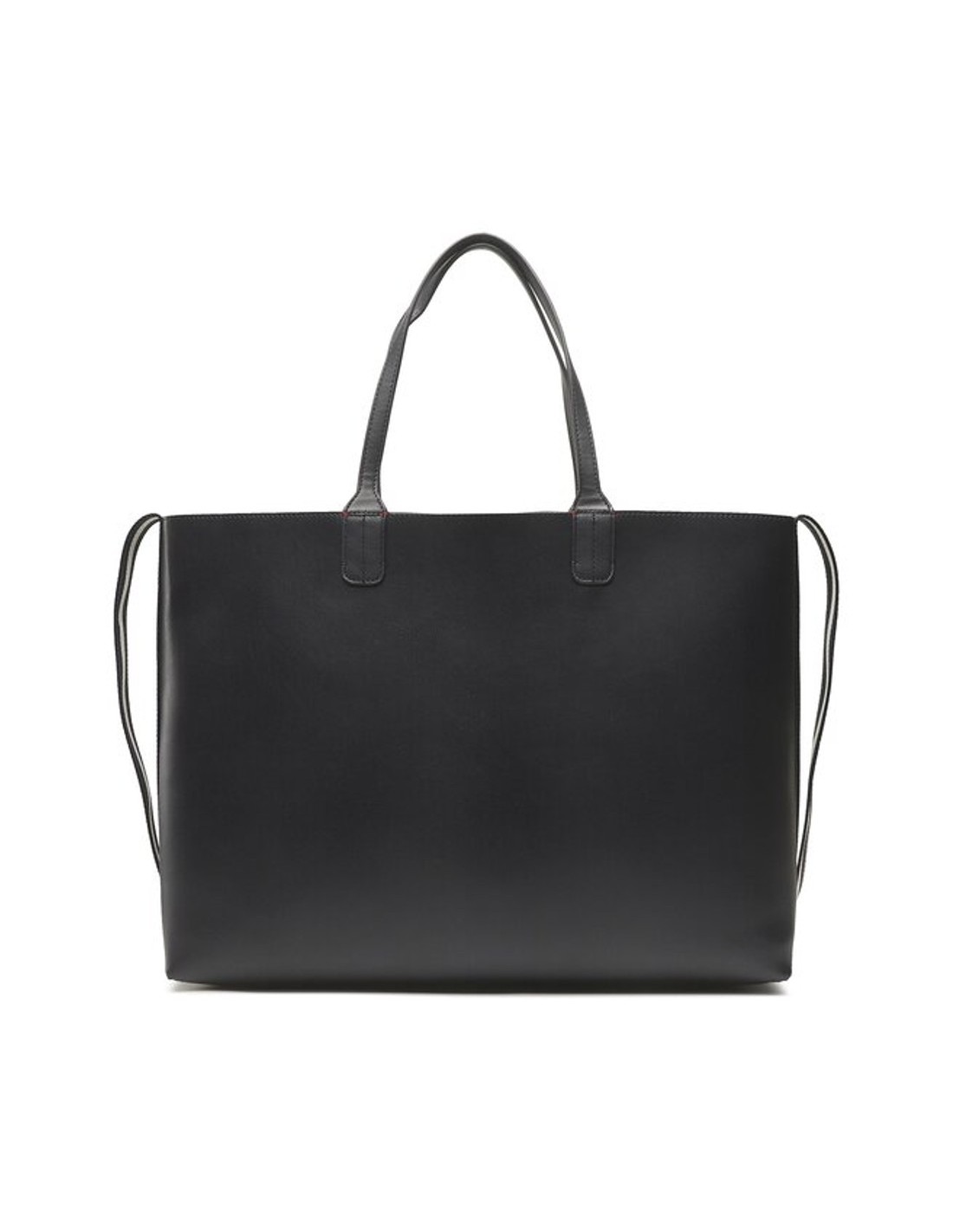 O bolso shopper Tommy Hilfiger Iconic com fita distintiva é confeccionado em 100% poliuretano de acabamento liso e apresenta o monograma TH na sua frente e fita de riscas com as cores da marca nas costuras exteriores.