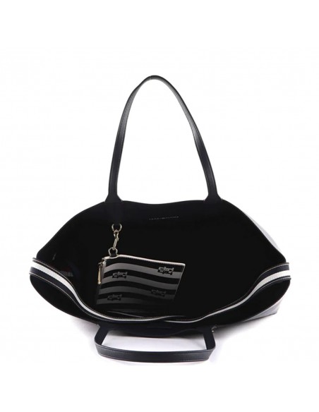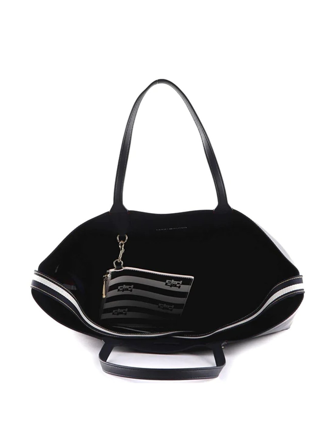 O bolso Tommy Hilfiger conta com um grande compartimento aberto e um bolsinho removível em contraste com fecho, tipo chaveiro, que pode ser pendurado no seu interior ou no exterior.