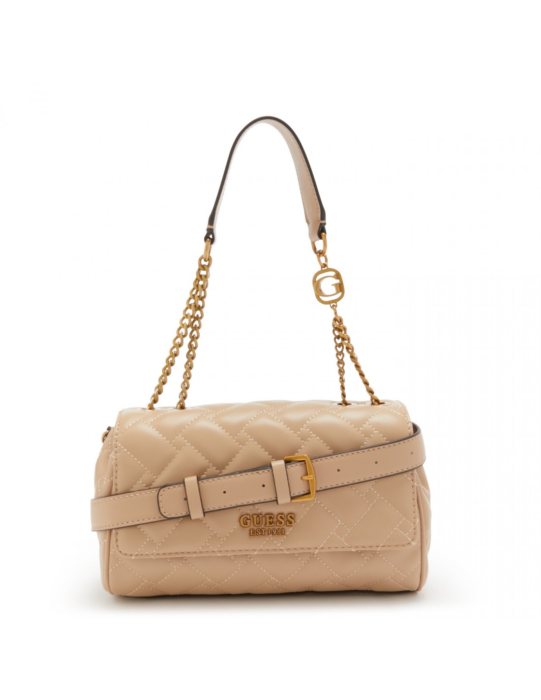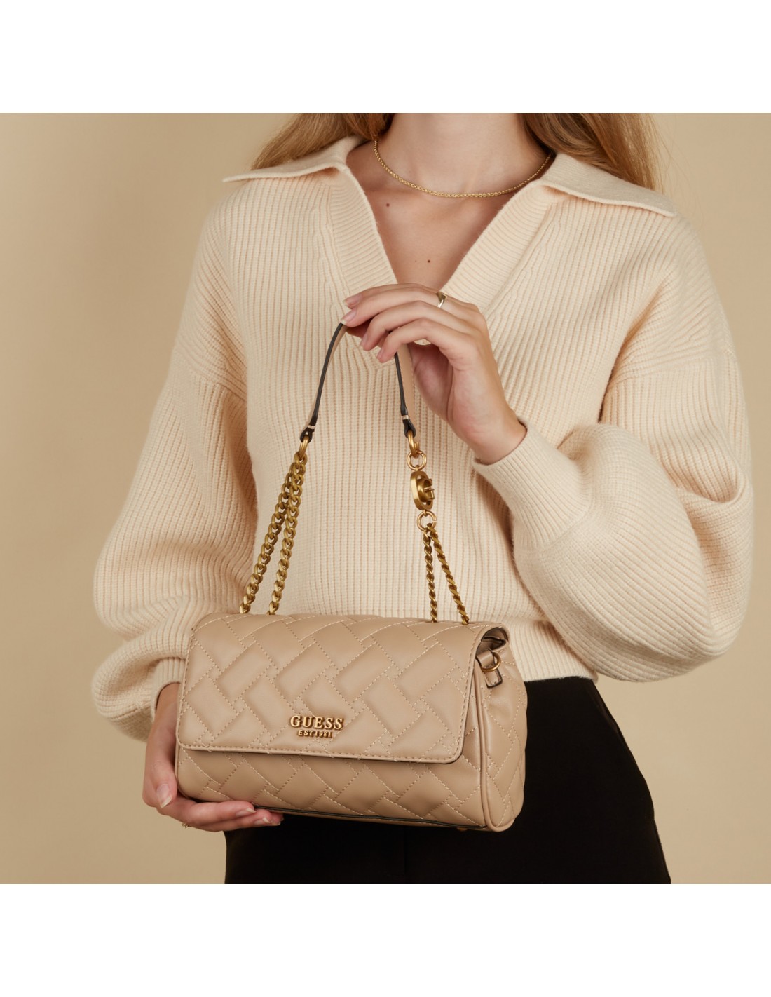 O bolso de ombro Guess Gracelynn é confeccionado em poliuretano na tonalidade bege com um design integral de pespontos, ferragens e corrente dupla curta com logotipo em dourado polido.
