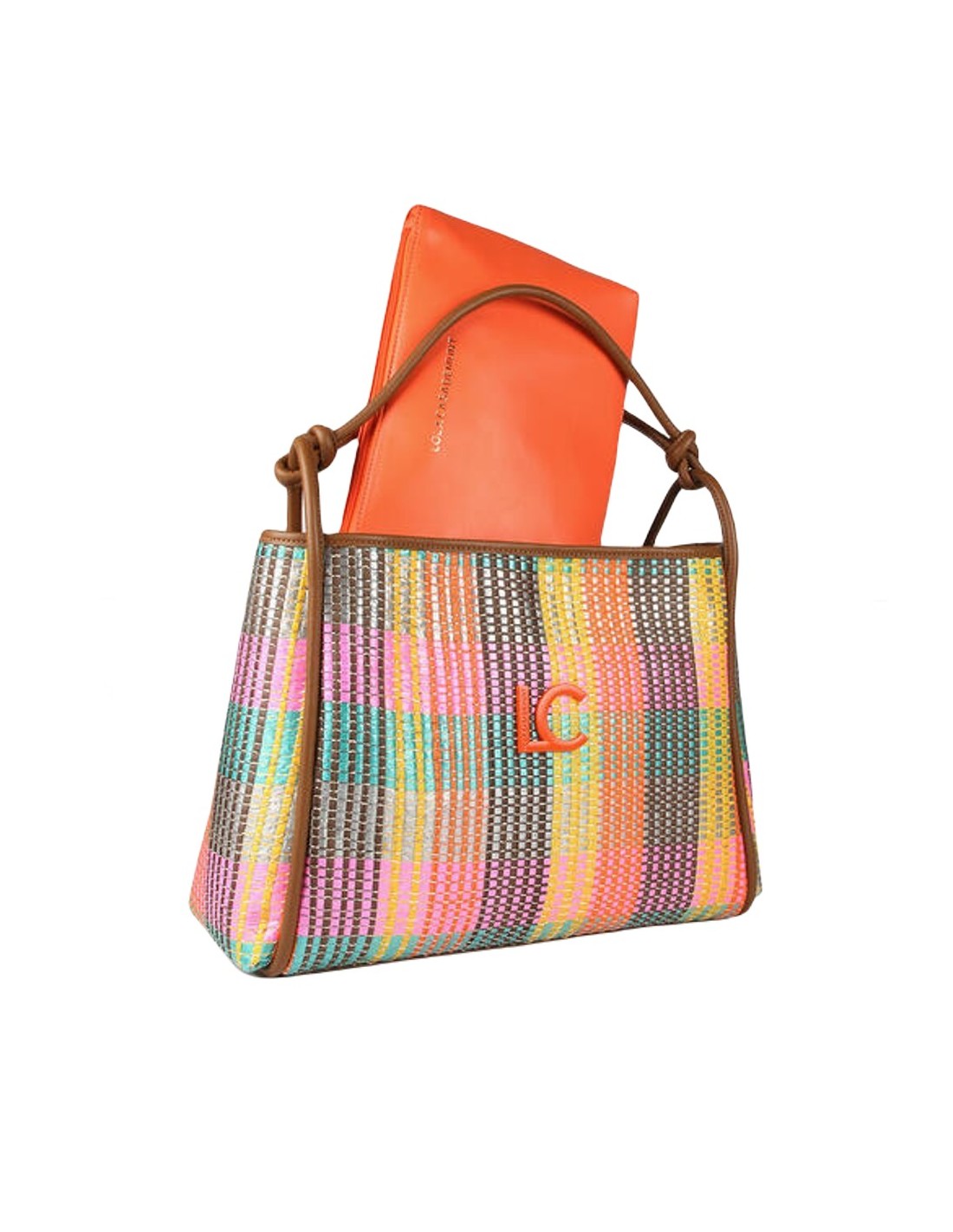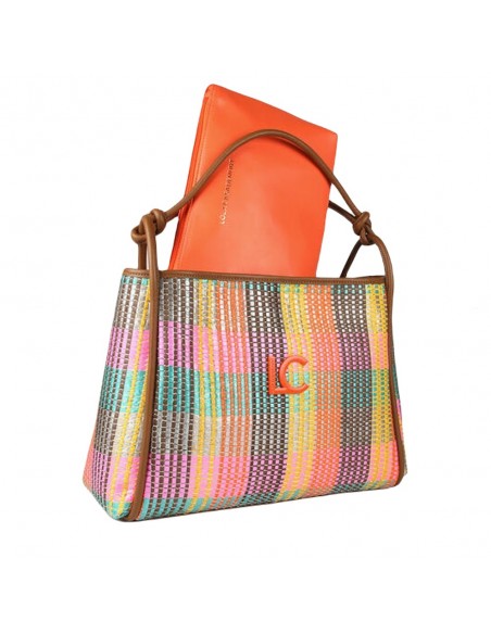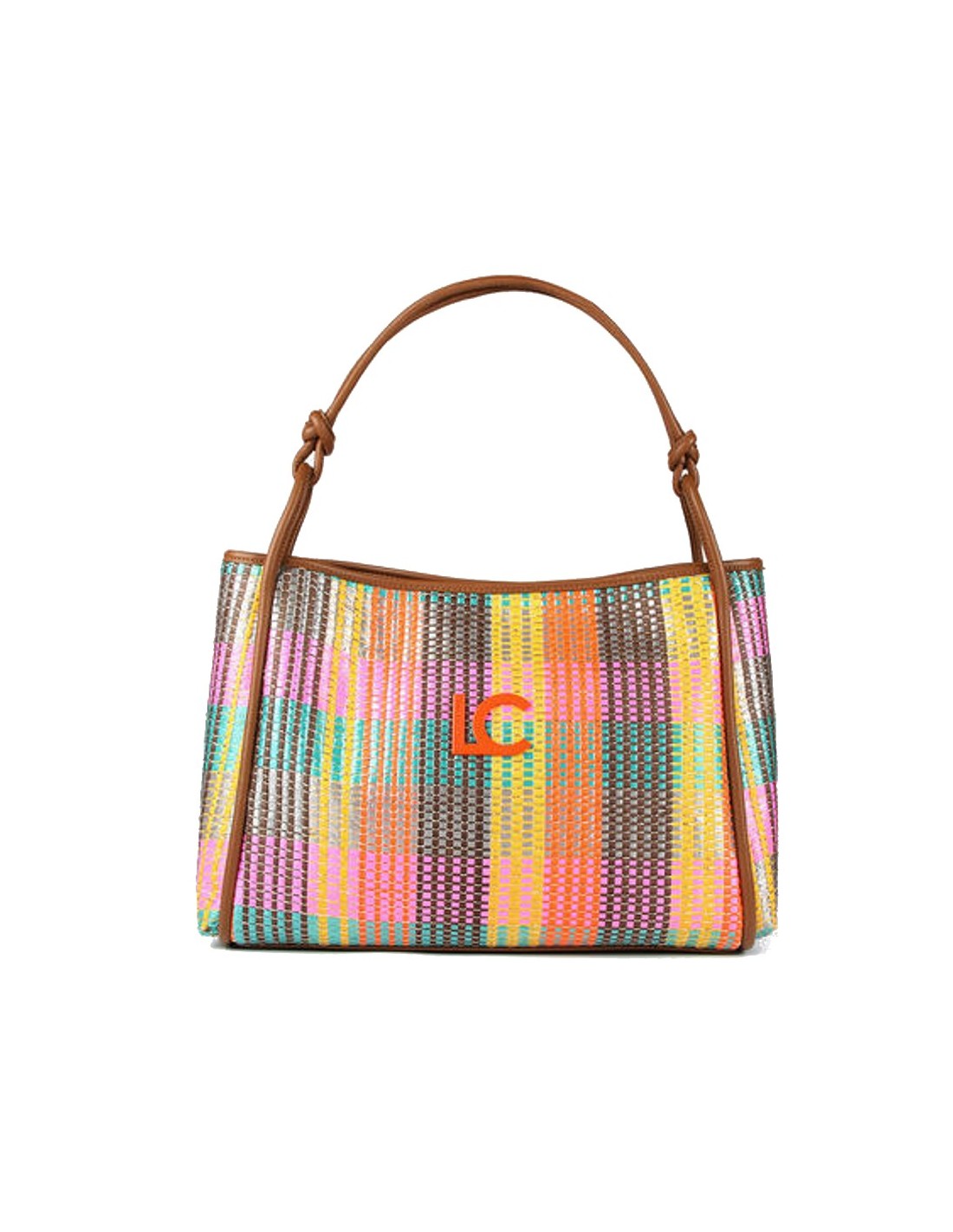 Confeccionada em material sintético, efeito ráfia, a bolsa de ombro Lola Casademunt apresenta uma superfície multicolor com logotipo na parte frontal.
