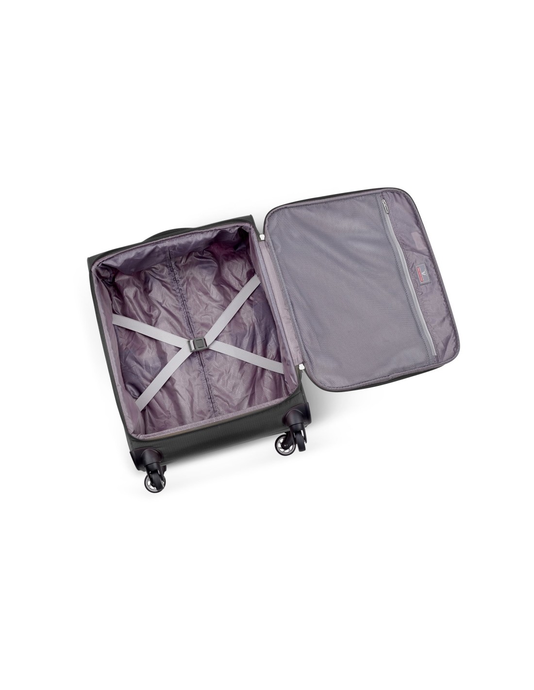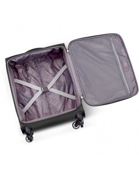 Esta mala de cabine eco-friendly Roncato, com interior forrado, apresenta no seu compartimento inferior correias elásticas de segurança e no superior, um prático bolso com fecho.