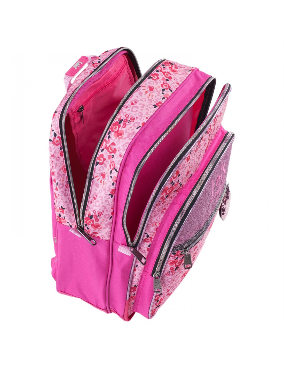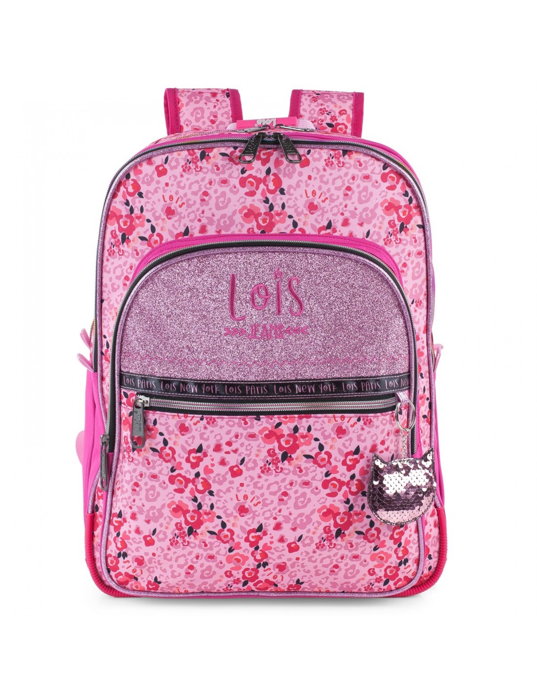 Esta mochila escolar adaptável apresenta um design ousado e juvenil que combina brilhos de purpurina com motivos florais e inclui um chaveiro decorativo com lantejoulas.