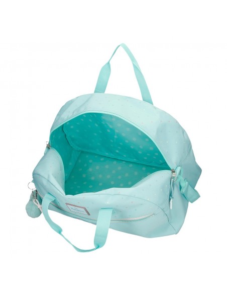 O bolso gym Pepe Jeans Nerea é confeccionado em um resistente poliéster turquesa com estampado de estrelas e diferentes logótipos, como o seu coração, por toda a parte.