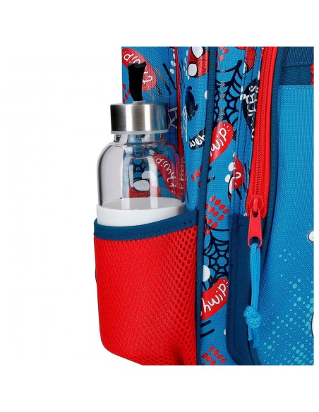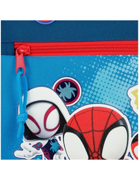 A mochila de creche Marvel Go Webs Go Spidey apresenta um divertido estampado frontal com a versão infantil do Spiderman, Spidey e a sua super equipa de amigos, Ghost Spider e Miles.