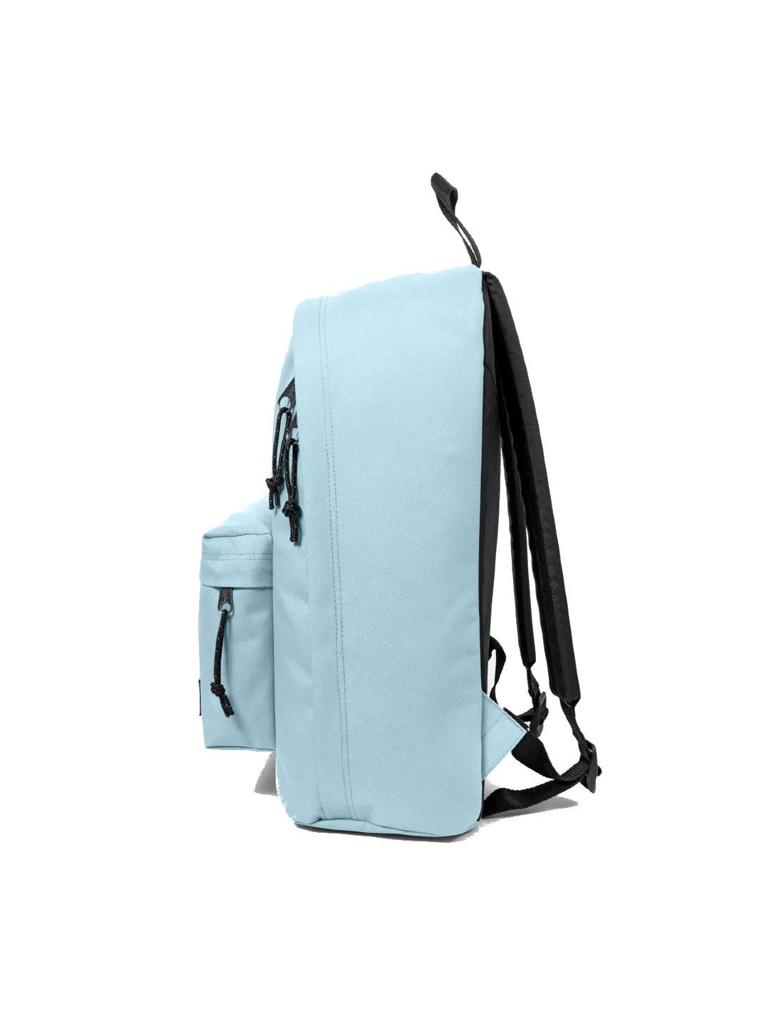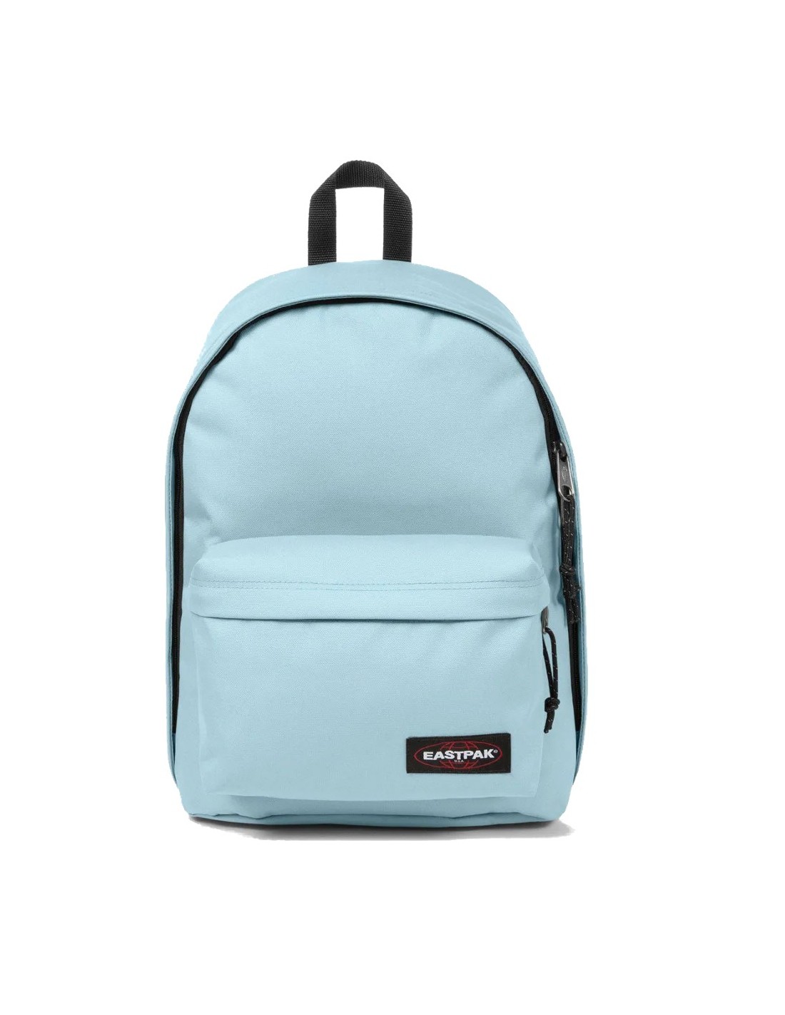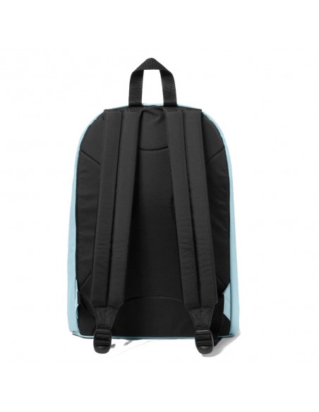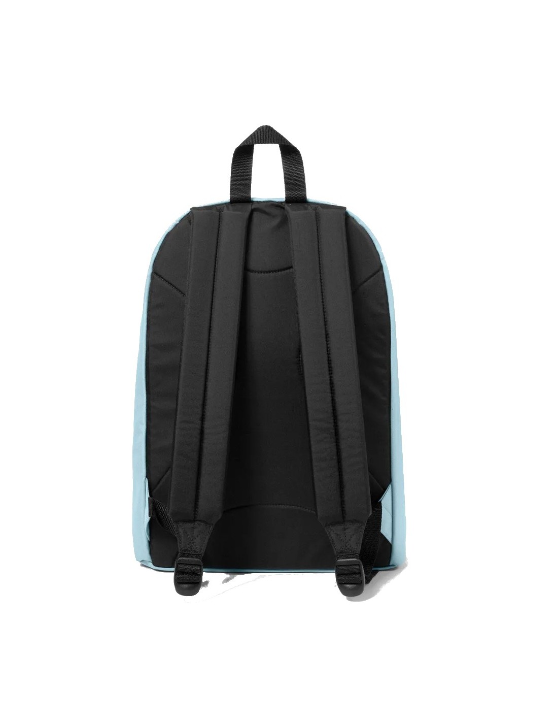 Resistente à água, a mochila ergonómica Eastpak Out of Office é fabricada em poliéster de cor azul claro.