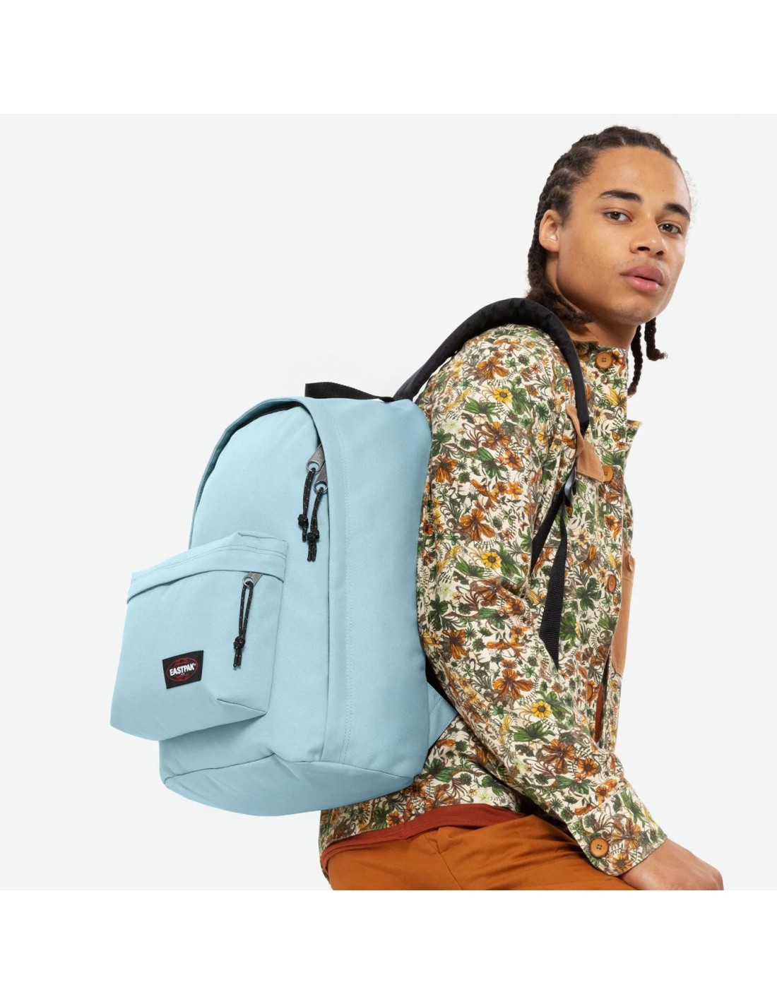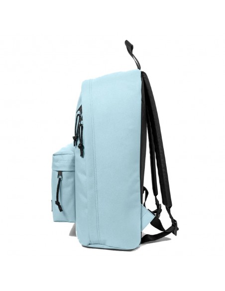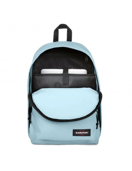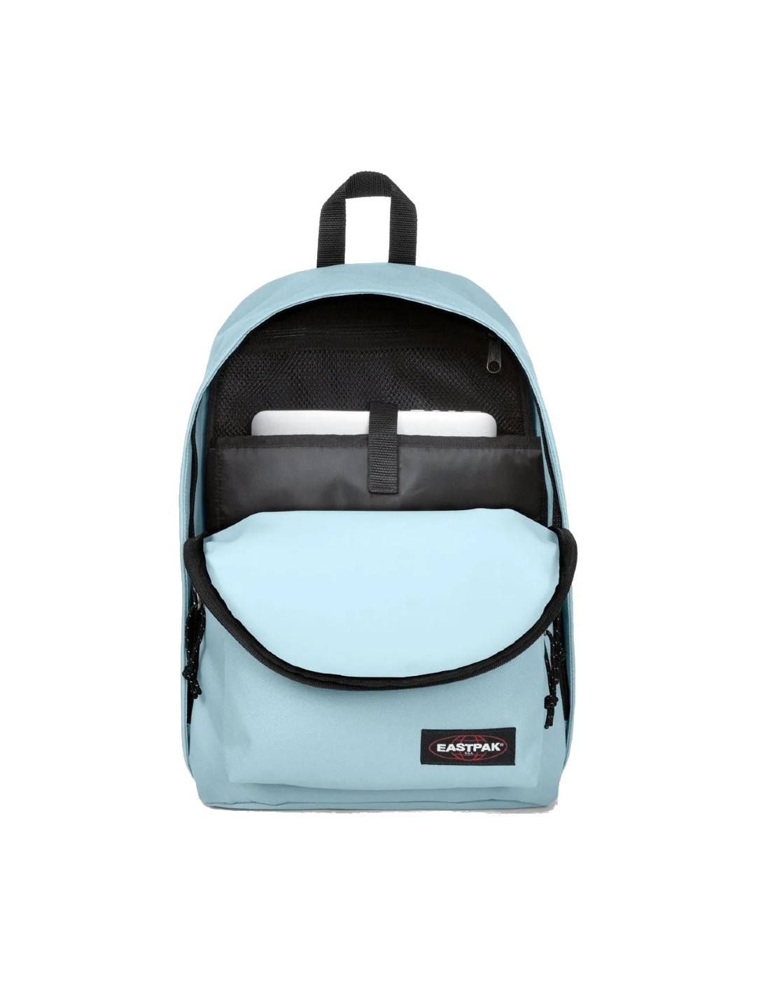 Resistente à água, a mochila ergonómica Eastpak Out of Office é fabricada em poliéster de cor azul claro.