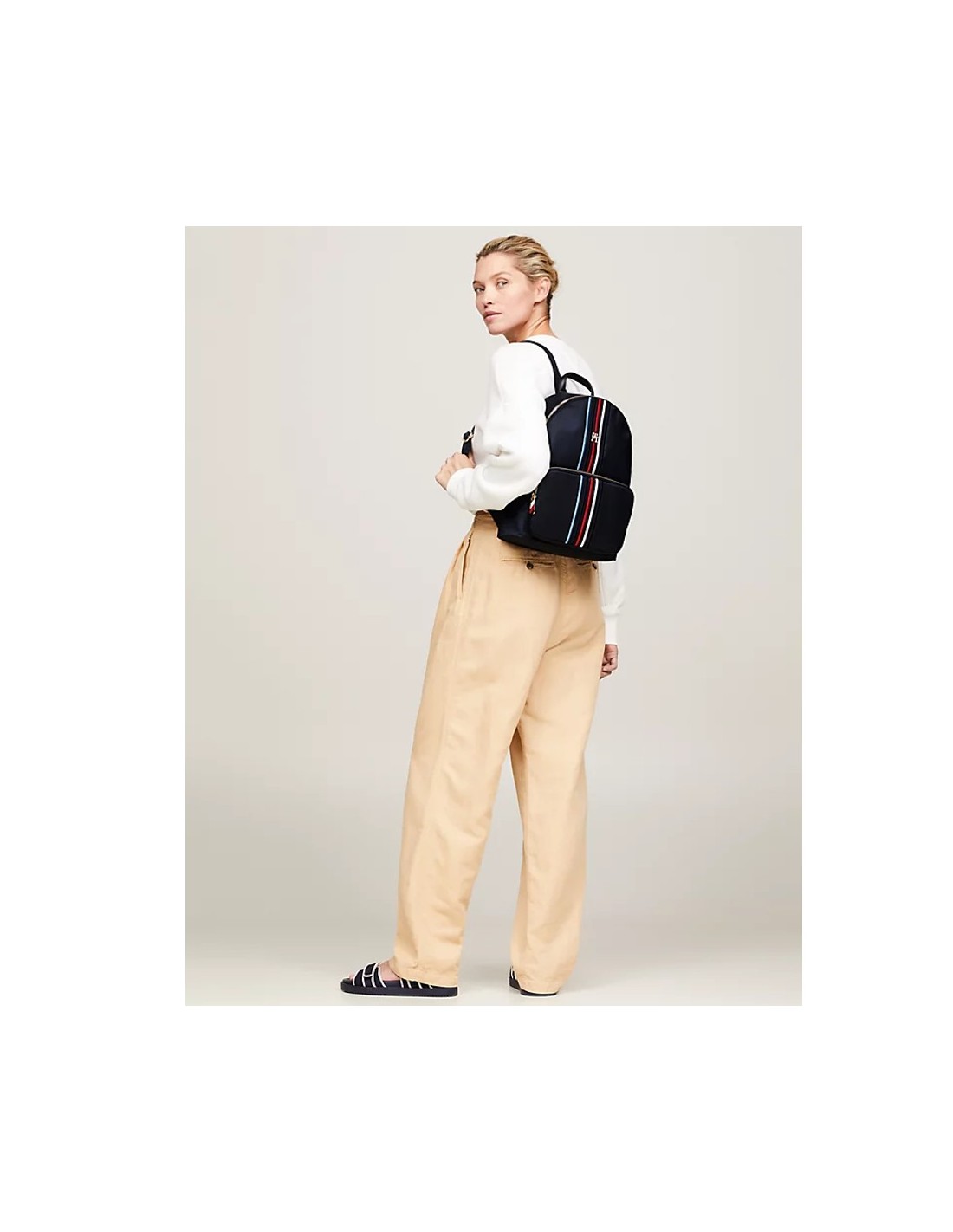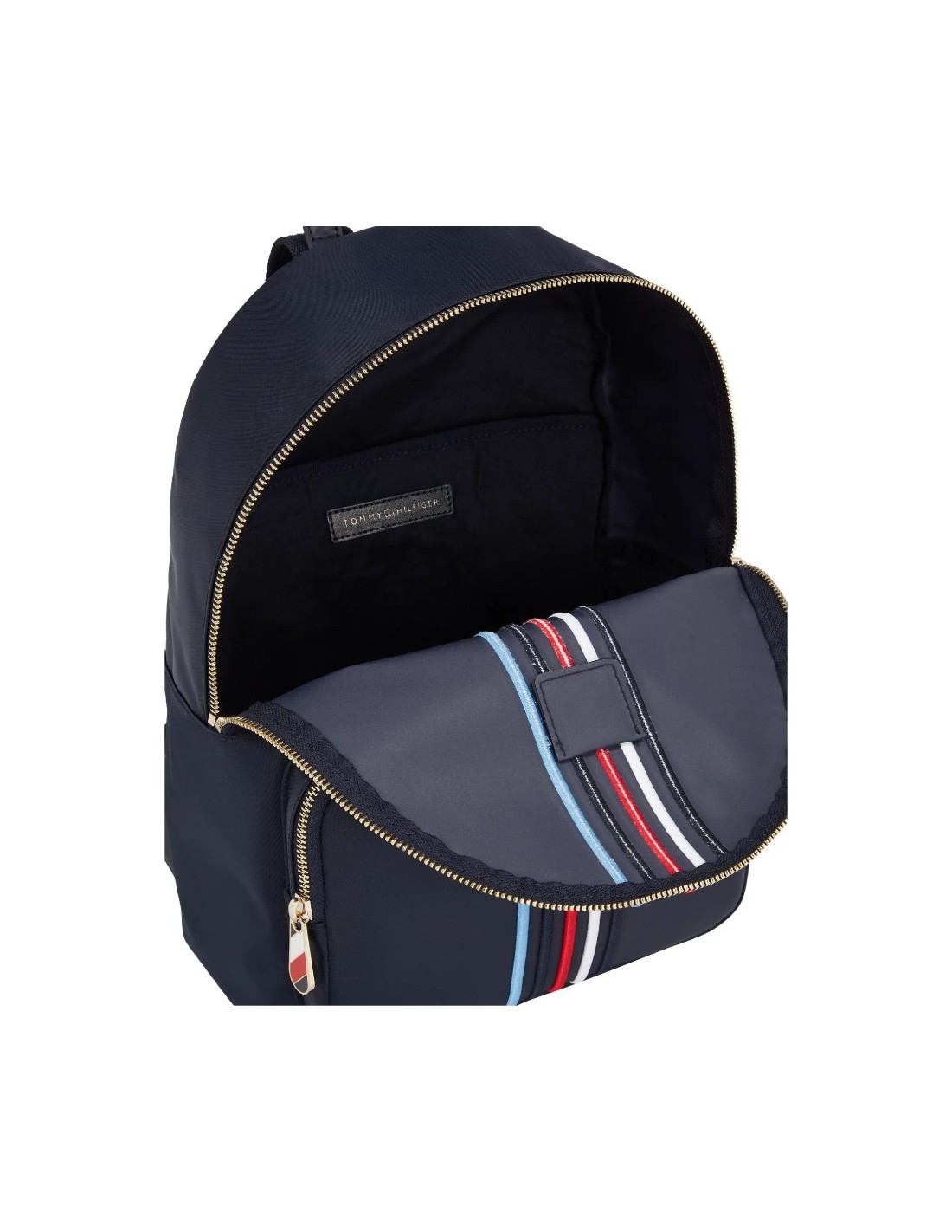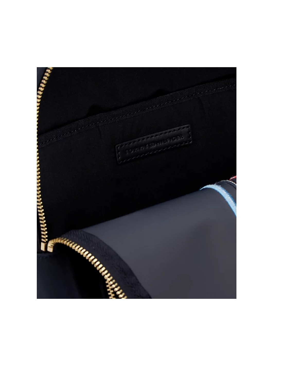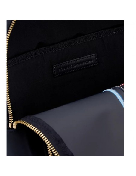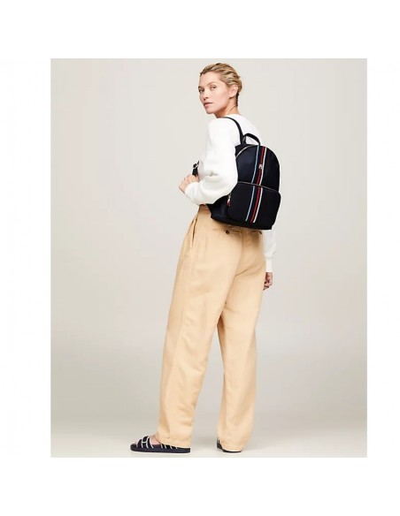 A mochila Tommy Hilfiger é confeccionada em 100% nylon reciclado com certificado independente, proveniente de tecidos usados, carpetes ou redes de pesca para reduzir o impacto ambiental.