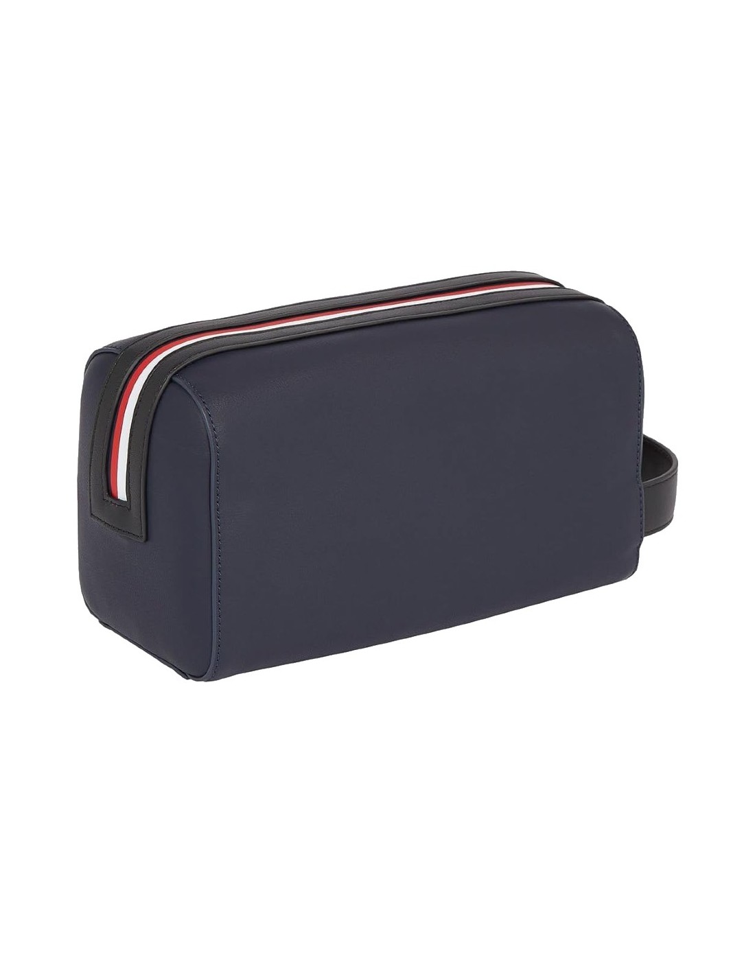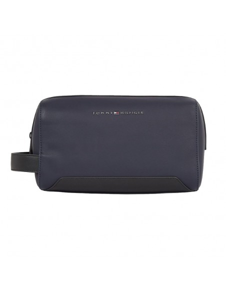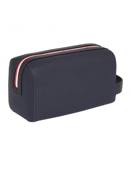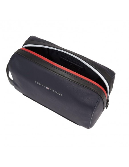 O necessaire Tommy Hilfiger TH Essential Corp é confeccionado em poliuretano da cor azul marinho e apresenta as cores distintivas da marca.