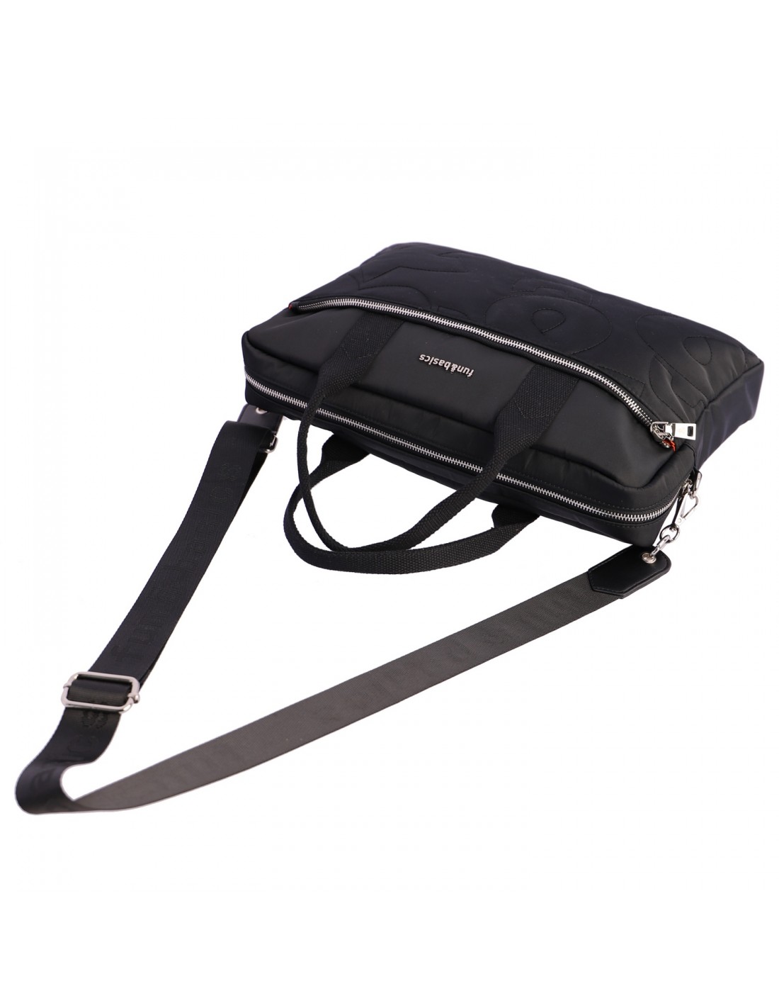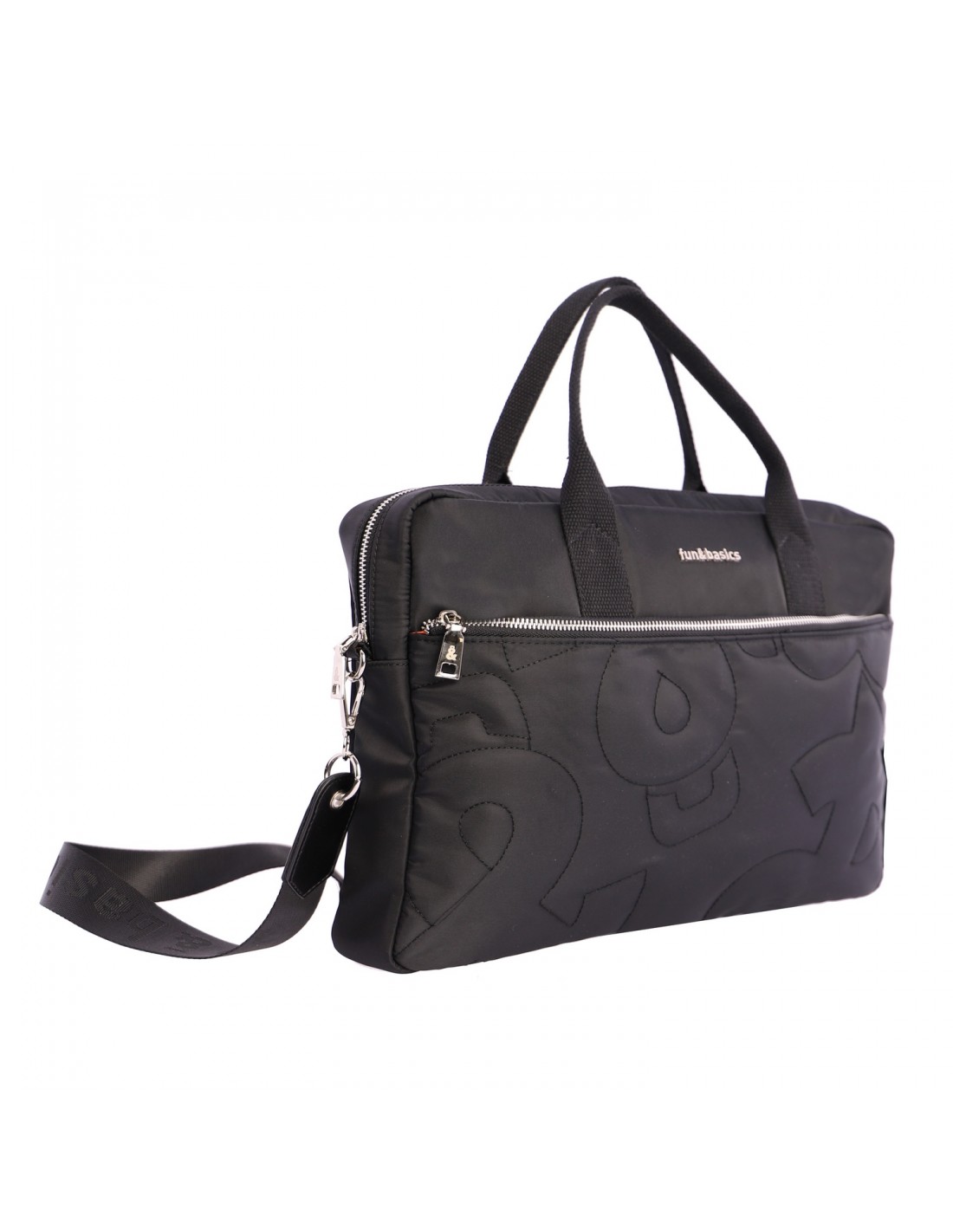 O portadocumentos Fun&Basics Logos apresenta um design elegante e prático em nylon preto com os logos da marca bordados no mesmo tom na parte frontal.