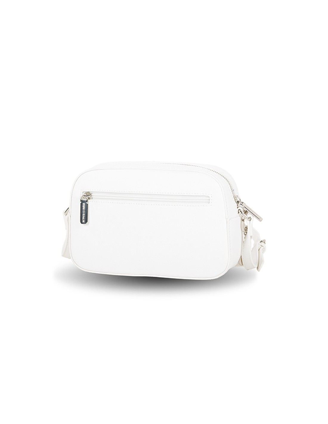 Confeccionado em PU branco, o bolso Devota and Lomba apresenta um bonito efeito saffiano com ferragens e logo em cor prata e como detalhe extra, um chaveiro porta-moedas destacável.