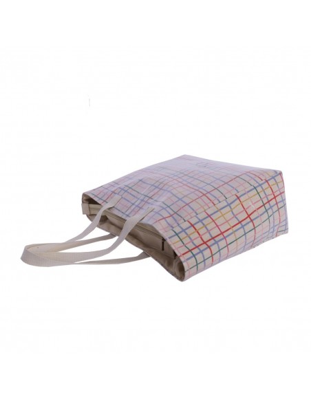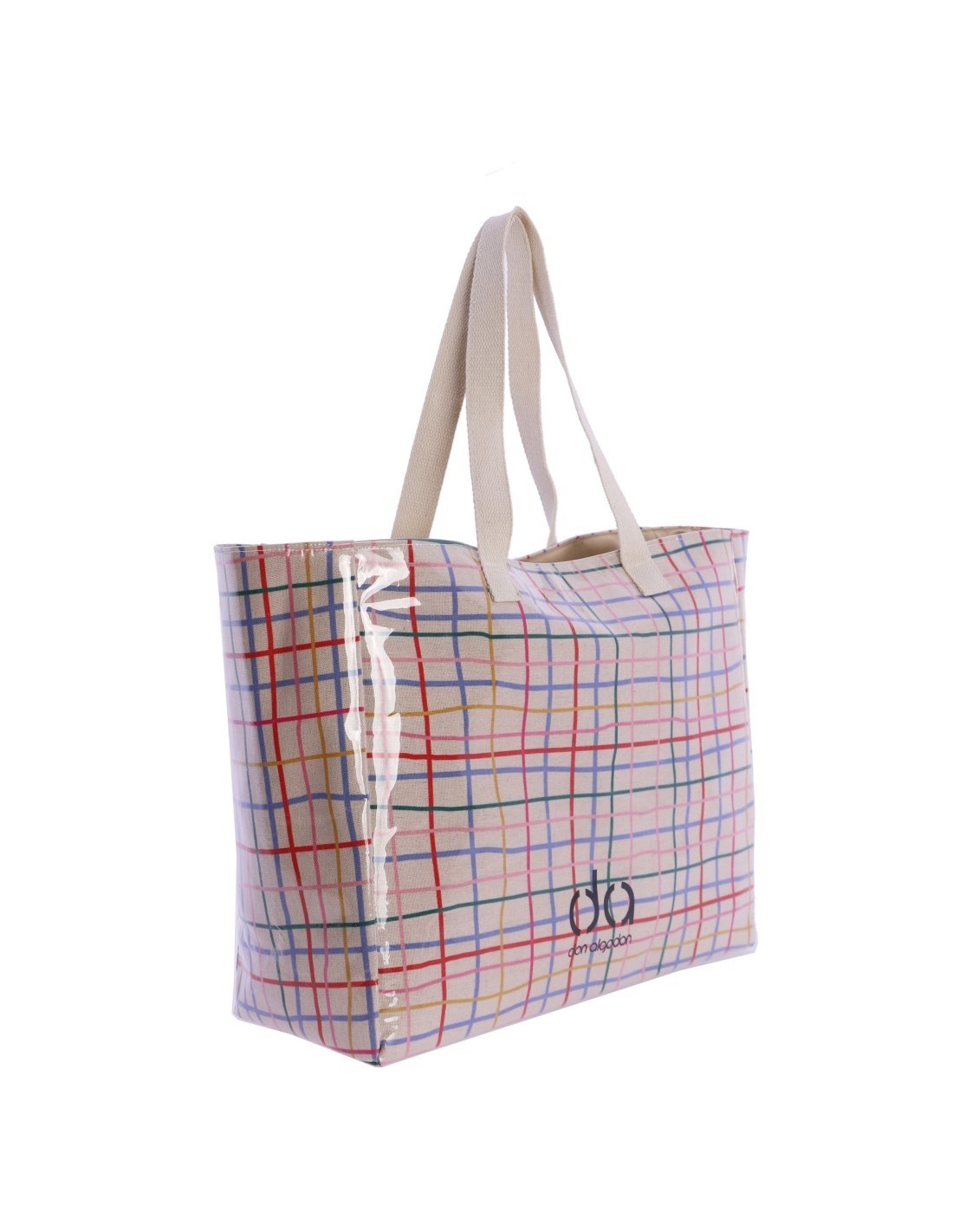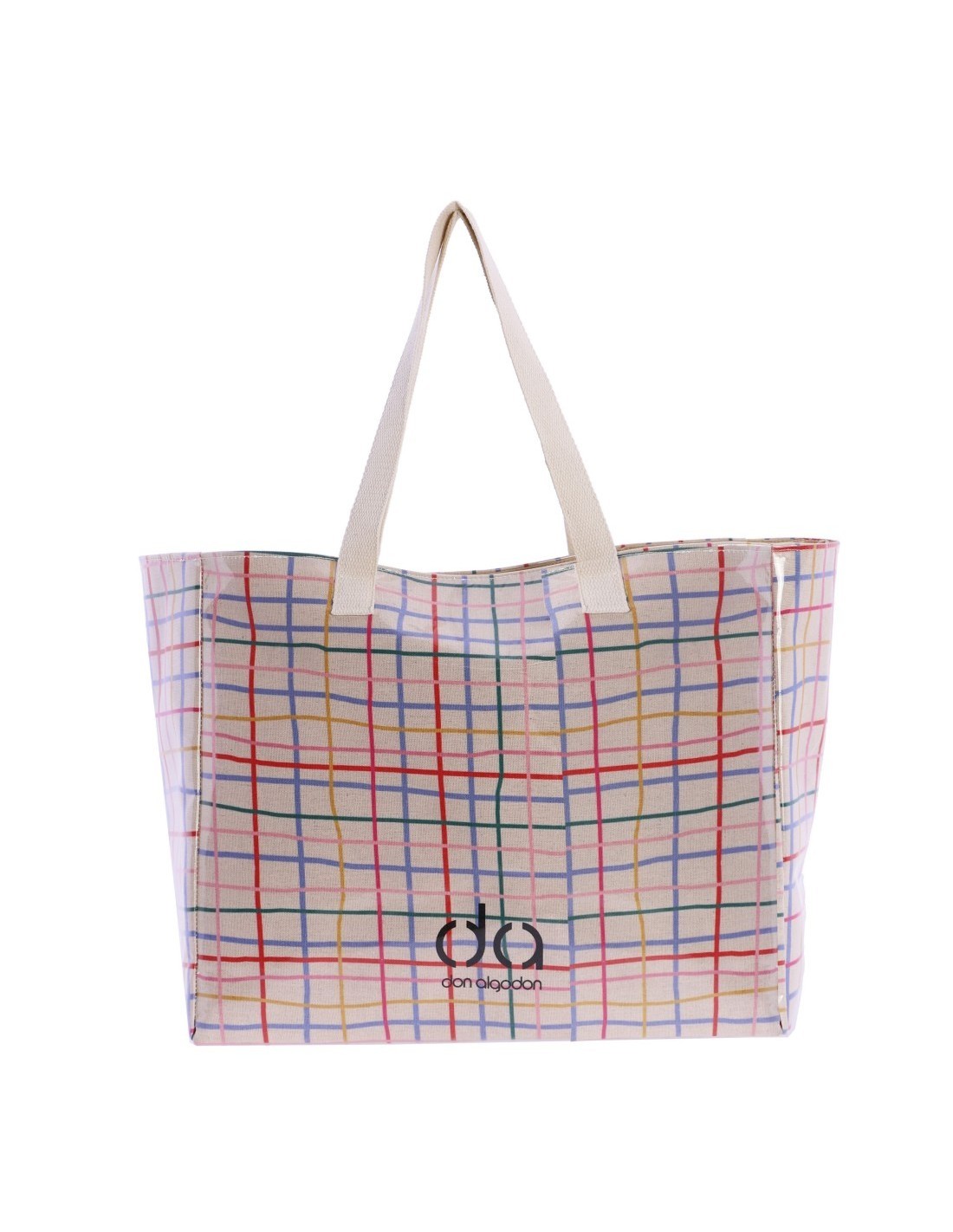 A bolsa de praia Don Algodón é confeccionada em lona plastificada com estampado de quadros multicolor e logótipo duplo da marca na sua parte da frente.