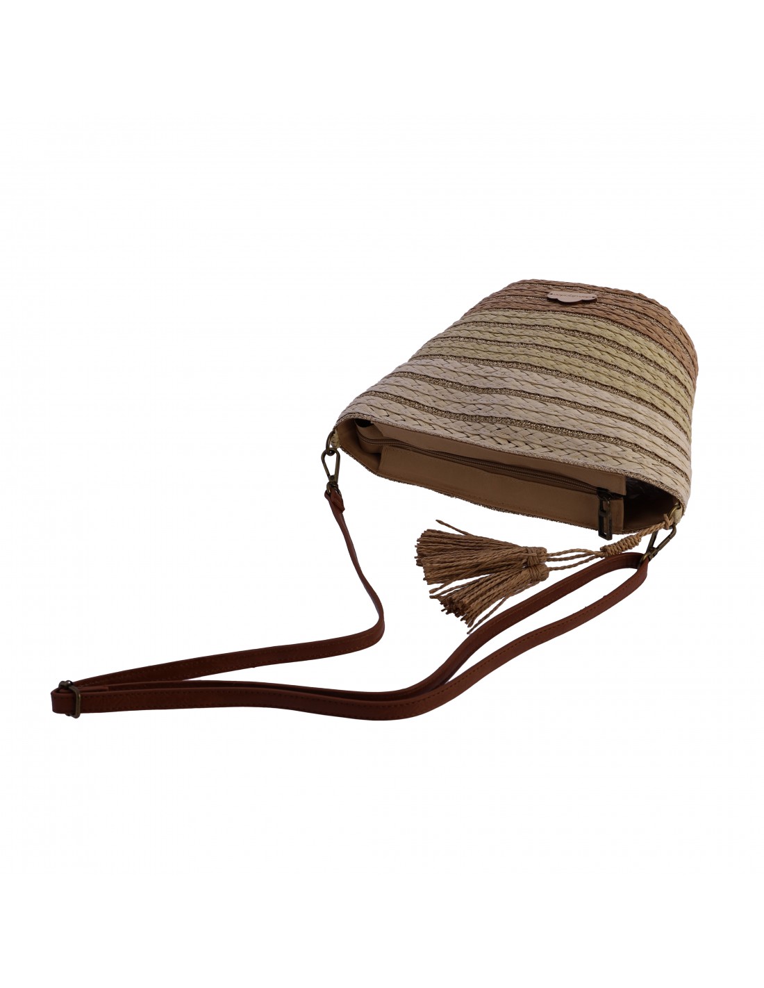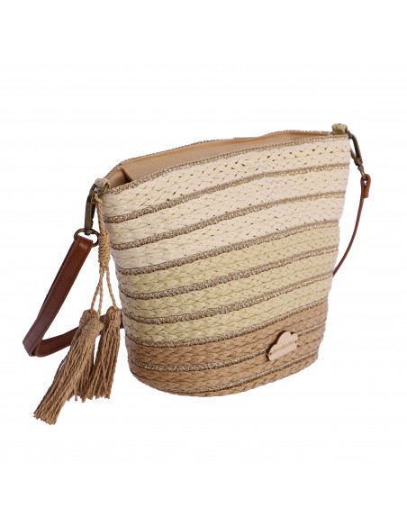 A bolsa bandoleira Don Algodon apresenta um bonito design de ráfia combinada em três tons de cor natural e, como detalhes, a sua alça longa em PU castanho.